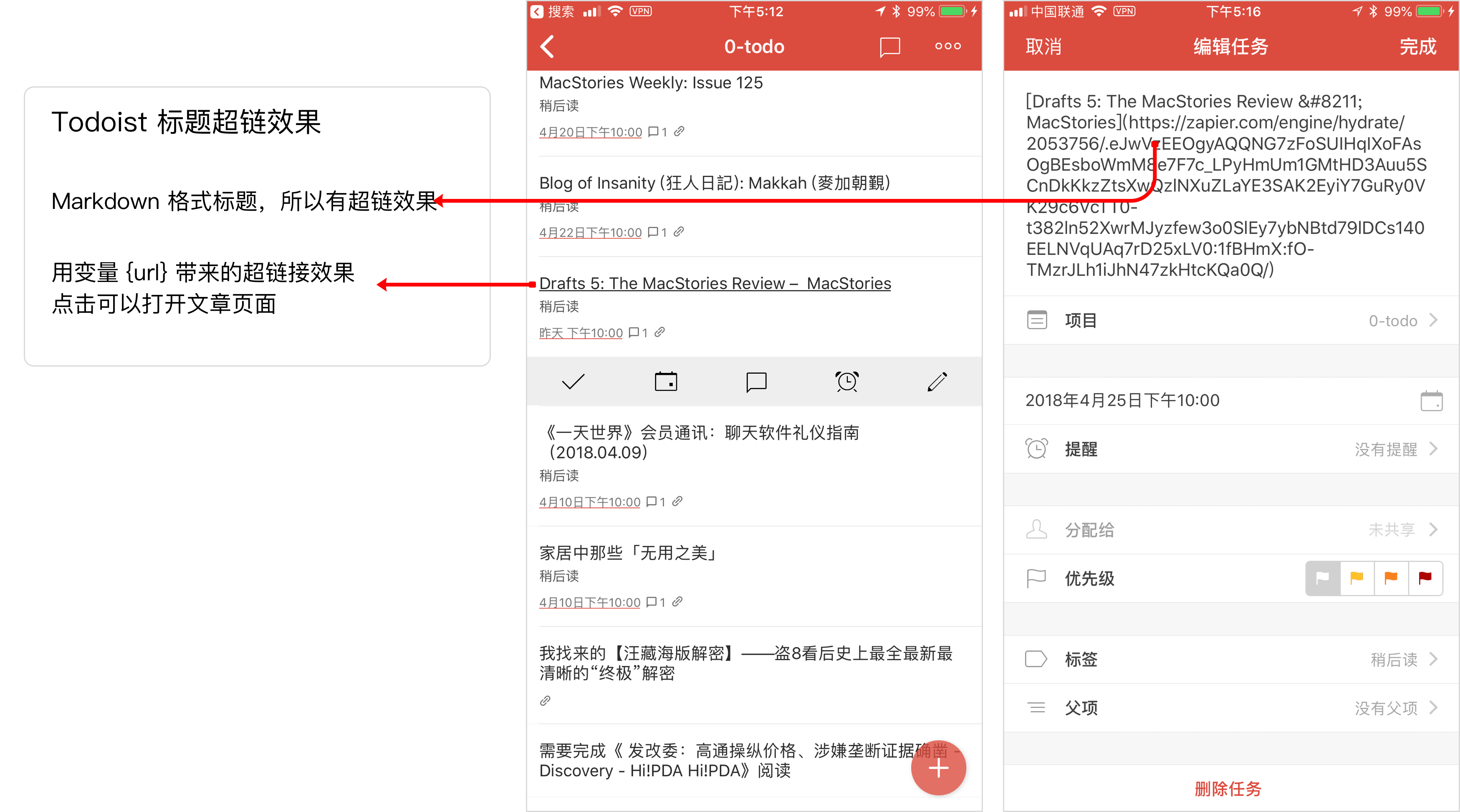 但是这种方式会带来「中文乱码」问题,这确实由于 IFTTT 的编码格式造成,解决方案是用 {url} 变量代替 {title} 变量。因为 Todoist 支持 Markdown 格式,而 {url} 变量是标准的 Markdown 格式。这样做的好处,可以点击 Todoist 中标题,直接跳转到文章页面阅读,如图: