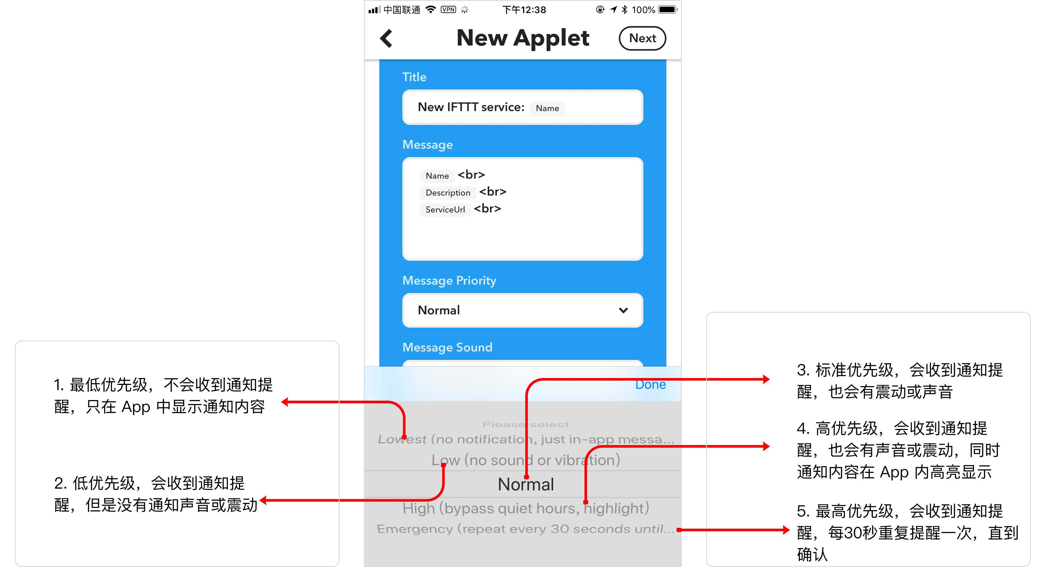 Emergency 最高优先级:会收到通知提醒,每 30 秒重复提醒一次,直到确认为止。