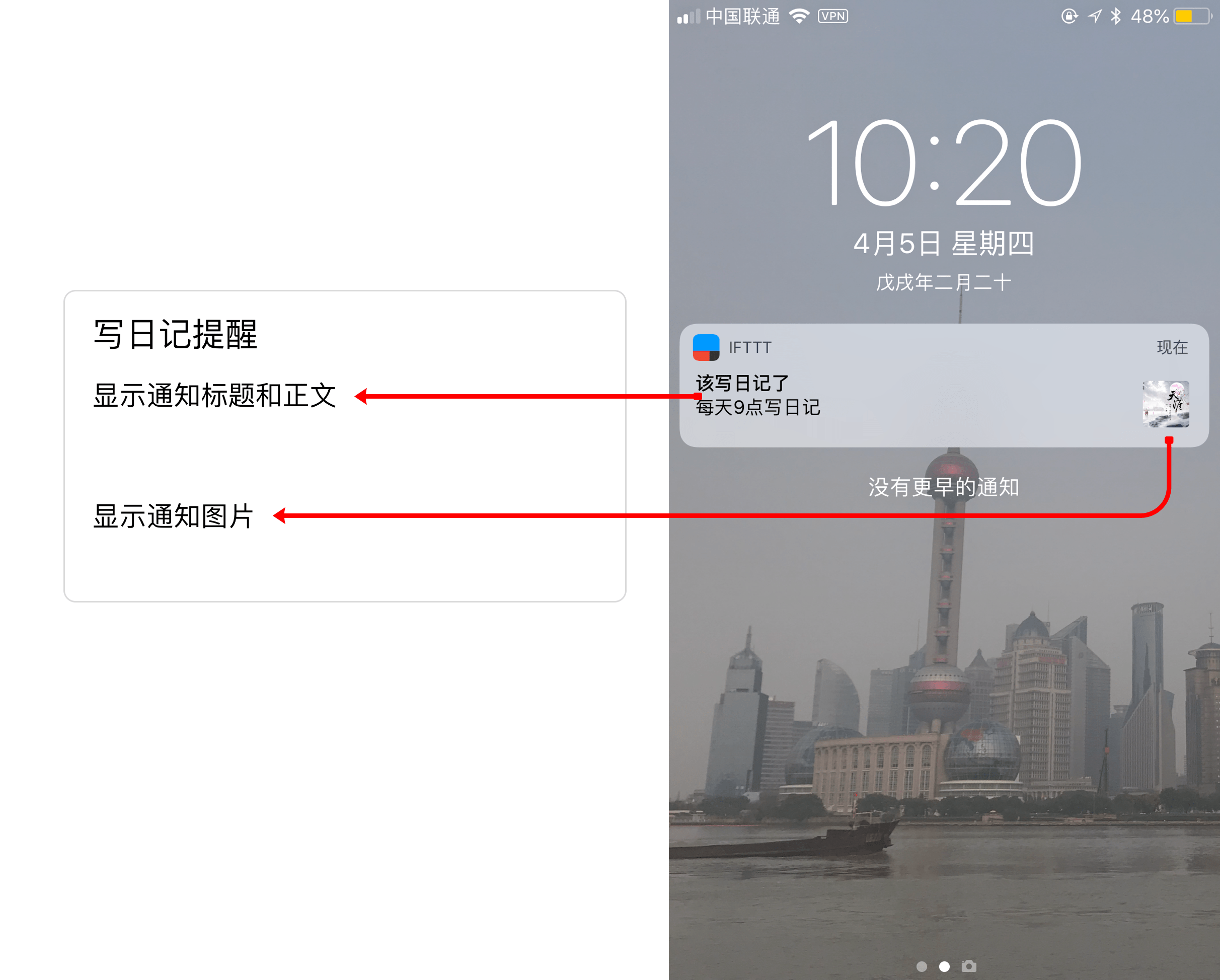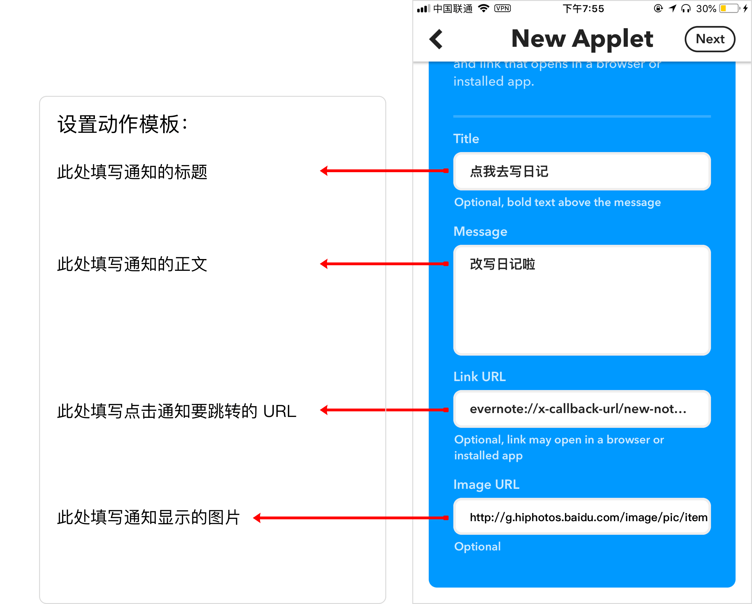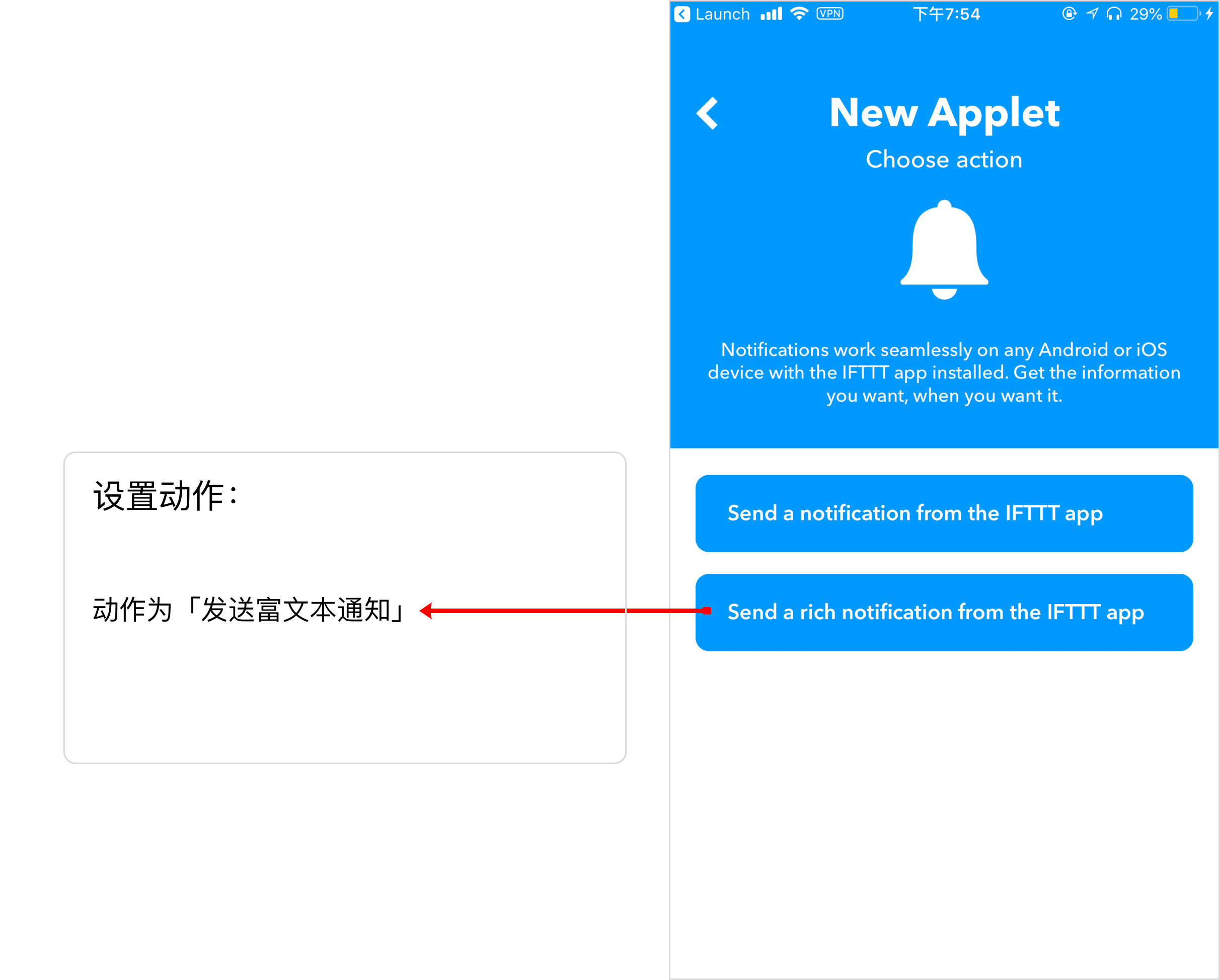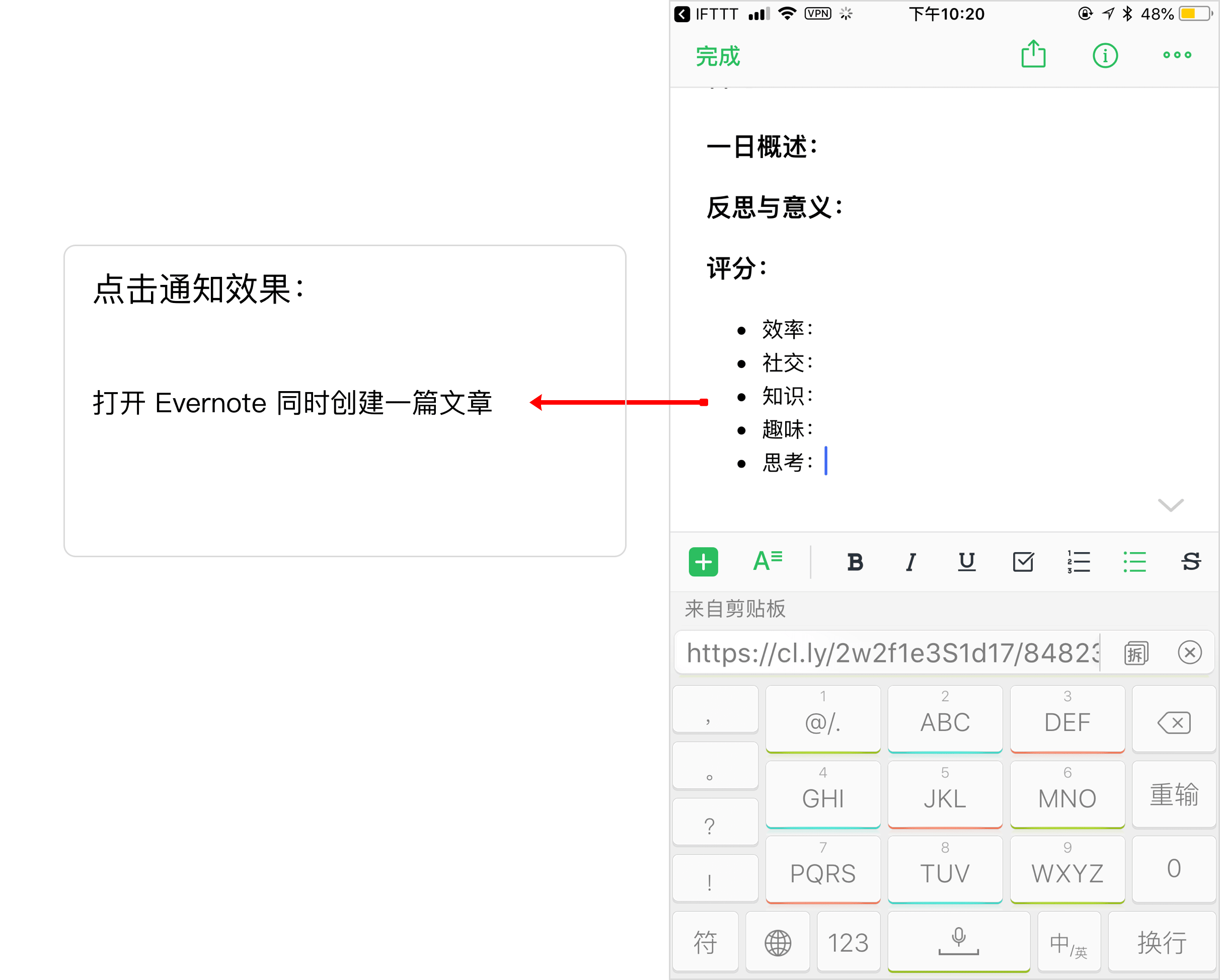 利用 IFTTT 发通知这件事对我们来说很简单了,那么如何实现「点击通知可以打开印象笔记,并且按照我的日记模版创建一篇日记」呢?这里就用到了「富文本通知」。