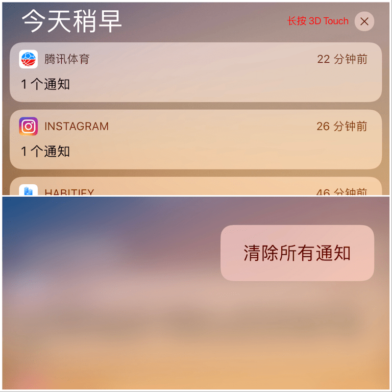 PS: 利用 3D Touch 长按「通知中心」右上角叉号,会出现「清除所有通知」。
