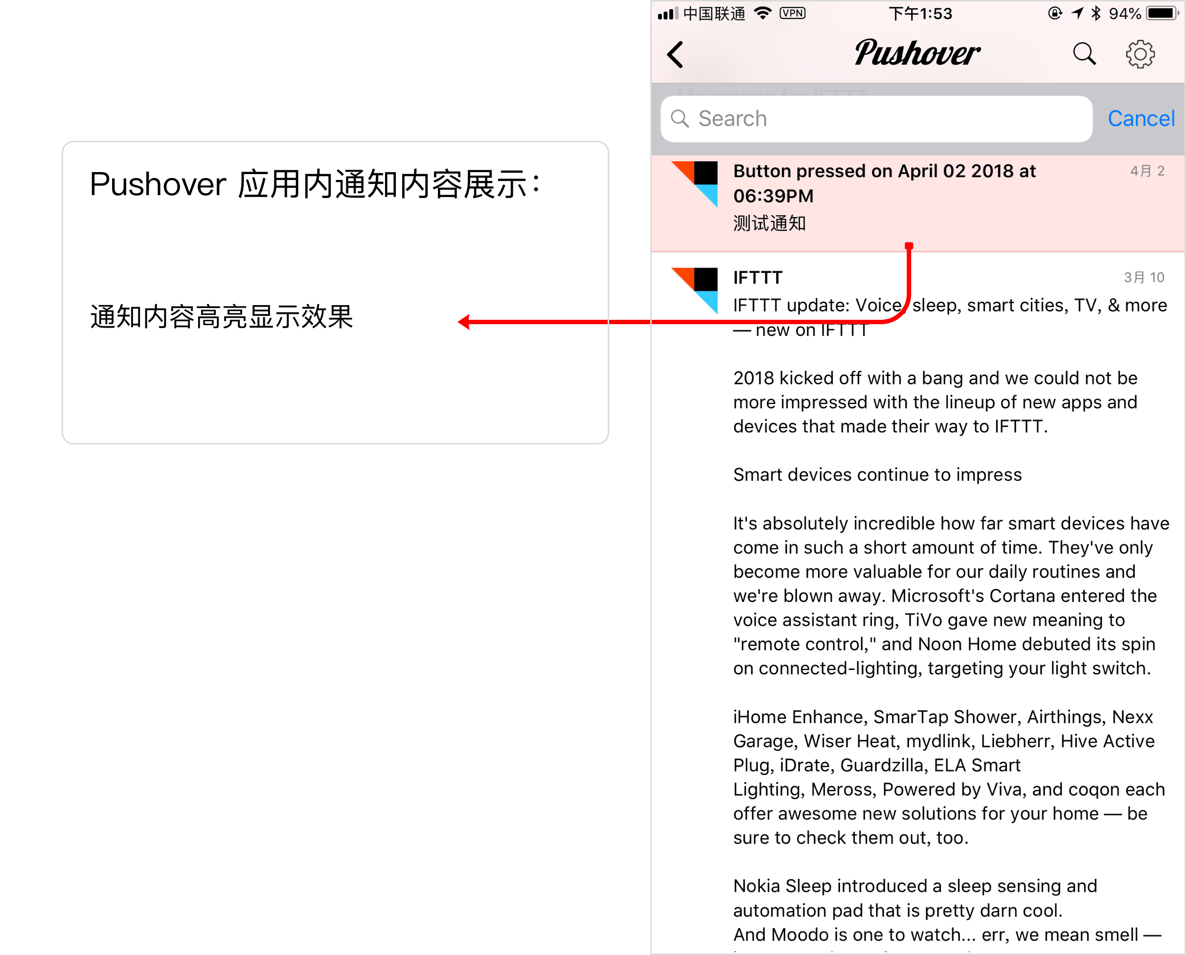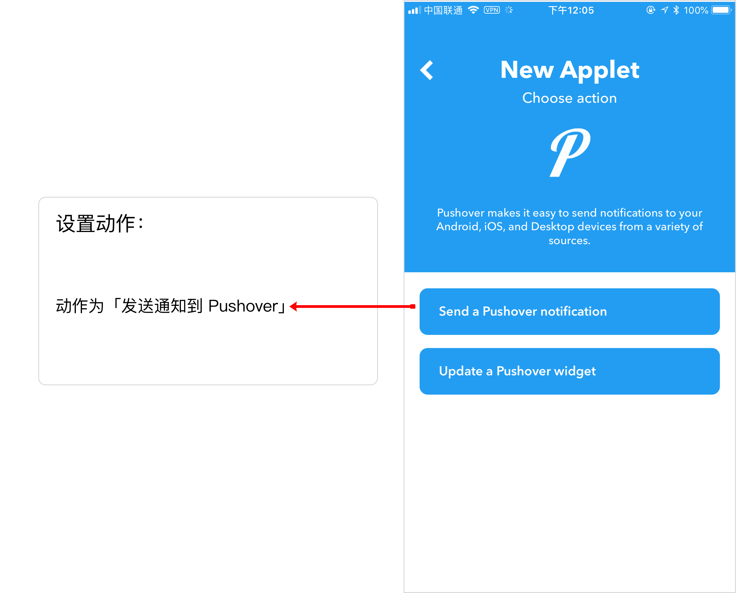 IFTTT 执行动作,「通过 Pushover 服务发送通知到手机」。