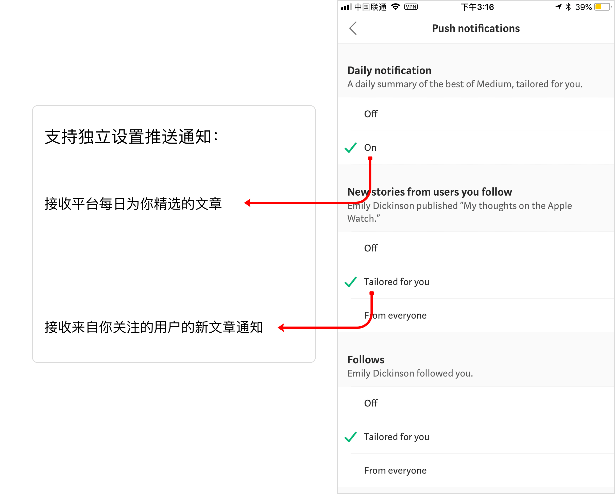 我们可以看一下做的比较好的例子, Medium 这款应用,在设置内允许用户选择推送通知的类型,这样就比较灵活,如图: 着陆页无法拓展:现阶段所有的通知点击后有两种不同的着陆结果,第一种就直接唤醒应用,简单粗暴,第二种则可以打开本应用的指定页面。但是如果我们想通过通知完成一些自动化,比如用 A 接收通知,打开的却是 B,就做不到。