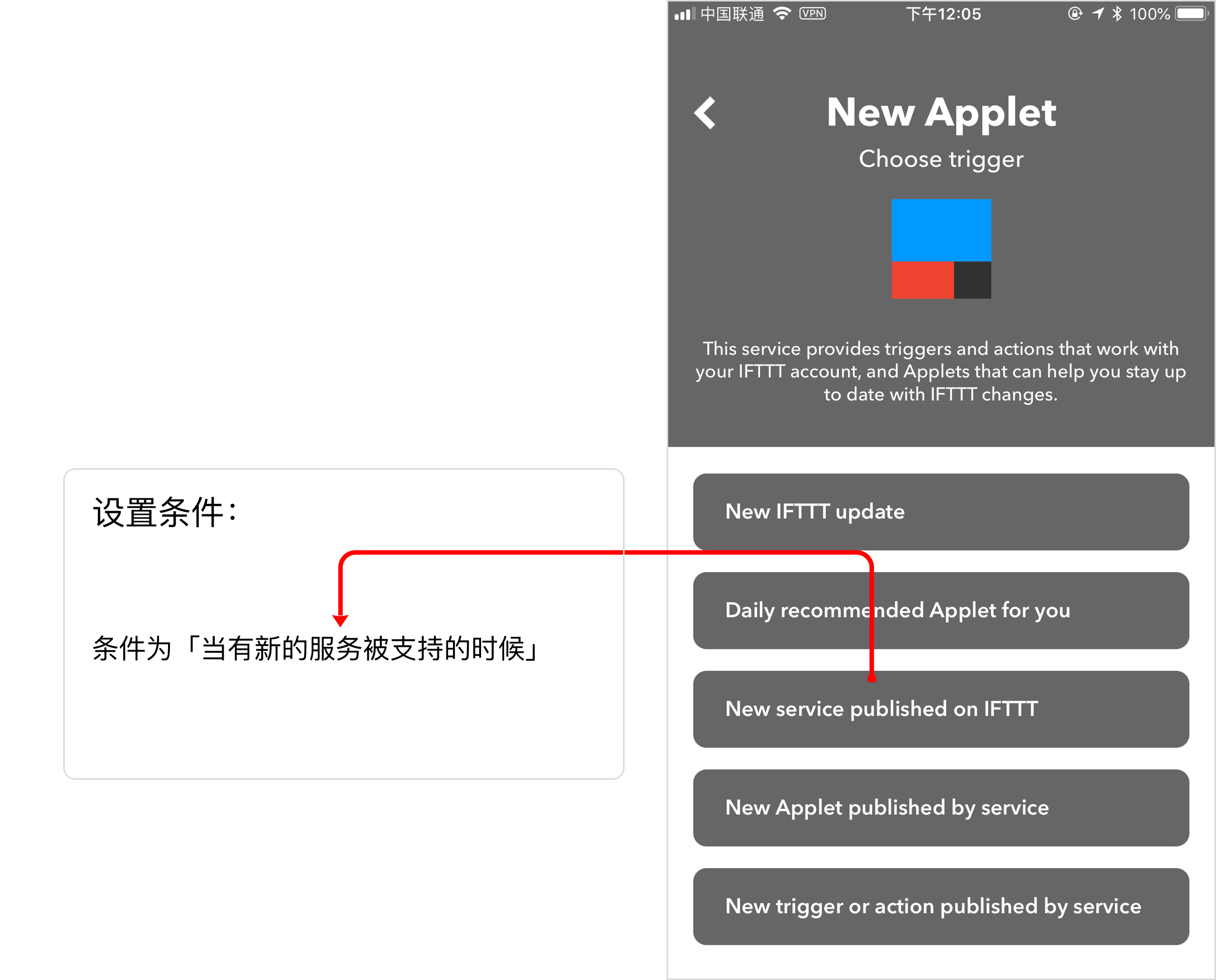 事例 4:IFTTT 中有一个服务,它可以实现「当 IFTTT 服务自身升级的时候发送提醒」。由于我经常使用 IFTTT,所以比较关注 IFTTT 最近又支持了哪些新服务,可以从里面发现一些有意思的用法。事例4 的关键实现步骤如下: