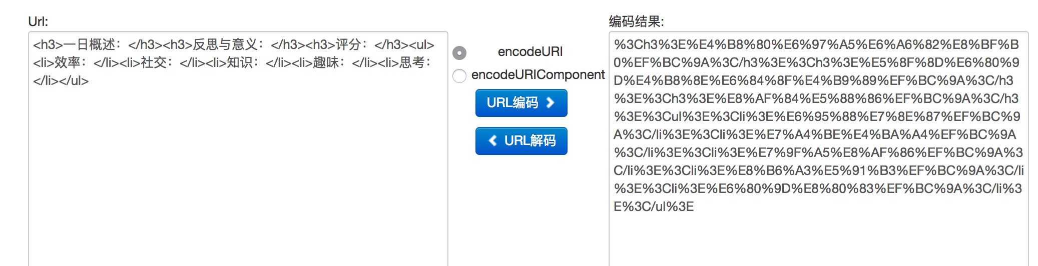 Evernote 官网给出了如何创建文章的 URL Schemes 示例,点击这篇文章查看,示例中可以看到,Evernote 通过 URL Schemes 创建文章有两种方式分别为 Text 和 HTML,其中 HTML 就是典型的富文本方式,我们通过 HTML 代码可以写出有样式的(字体字号不同)内容,所以这里我们采用 HTML 的方式创建这篇文章,文章内容如下: <h3>一日概述:</h3>