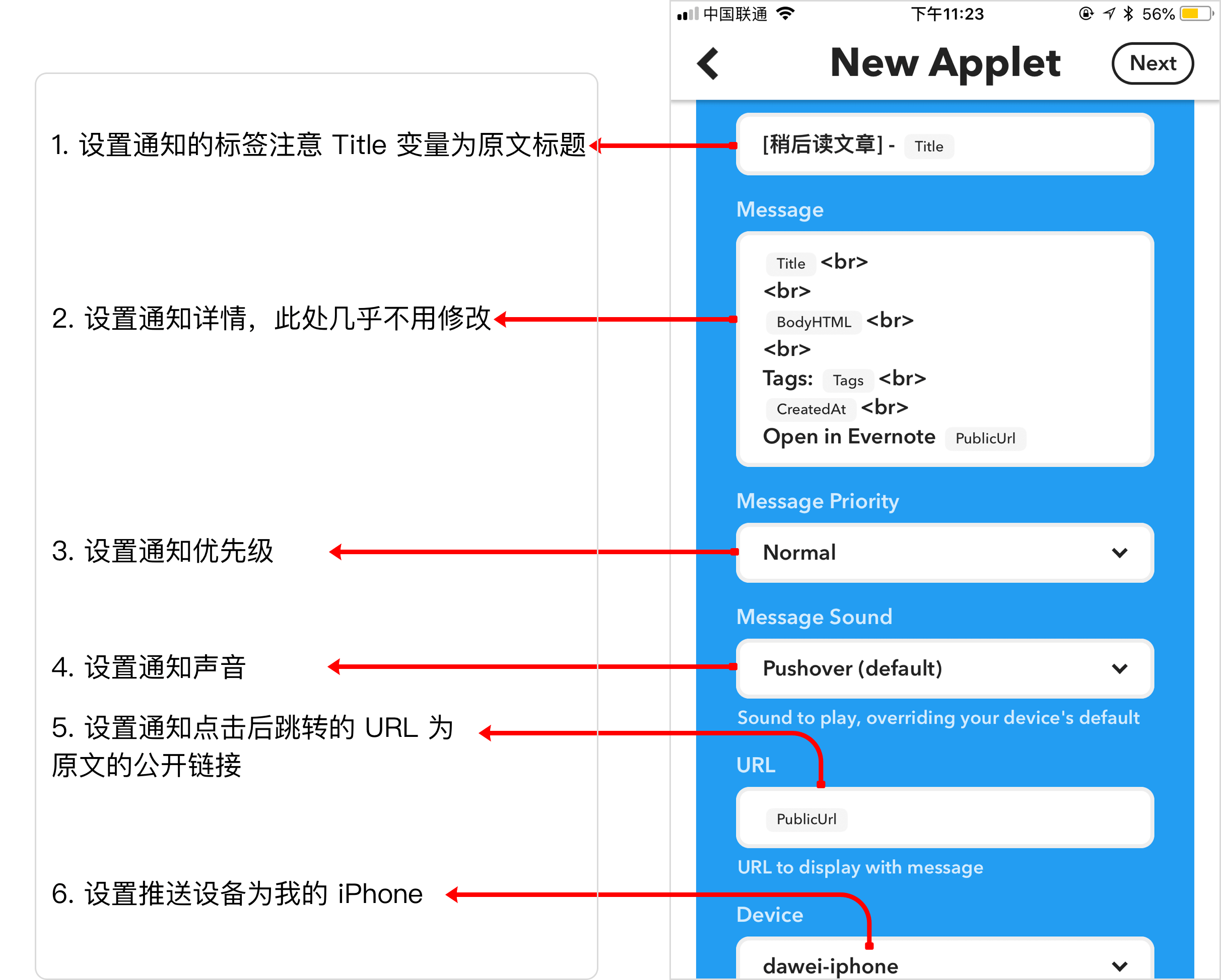 事例 3:我希望在 Evernote 中,如果一篇文章被设置「稍后读」标签,那么就发送通知到 Pushover ,点击通知可以打开这篇文章详情页进行阅读。