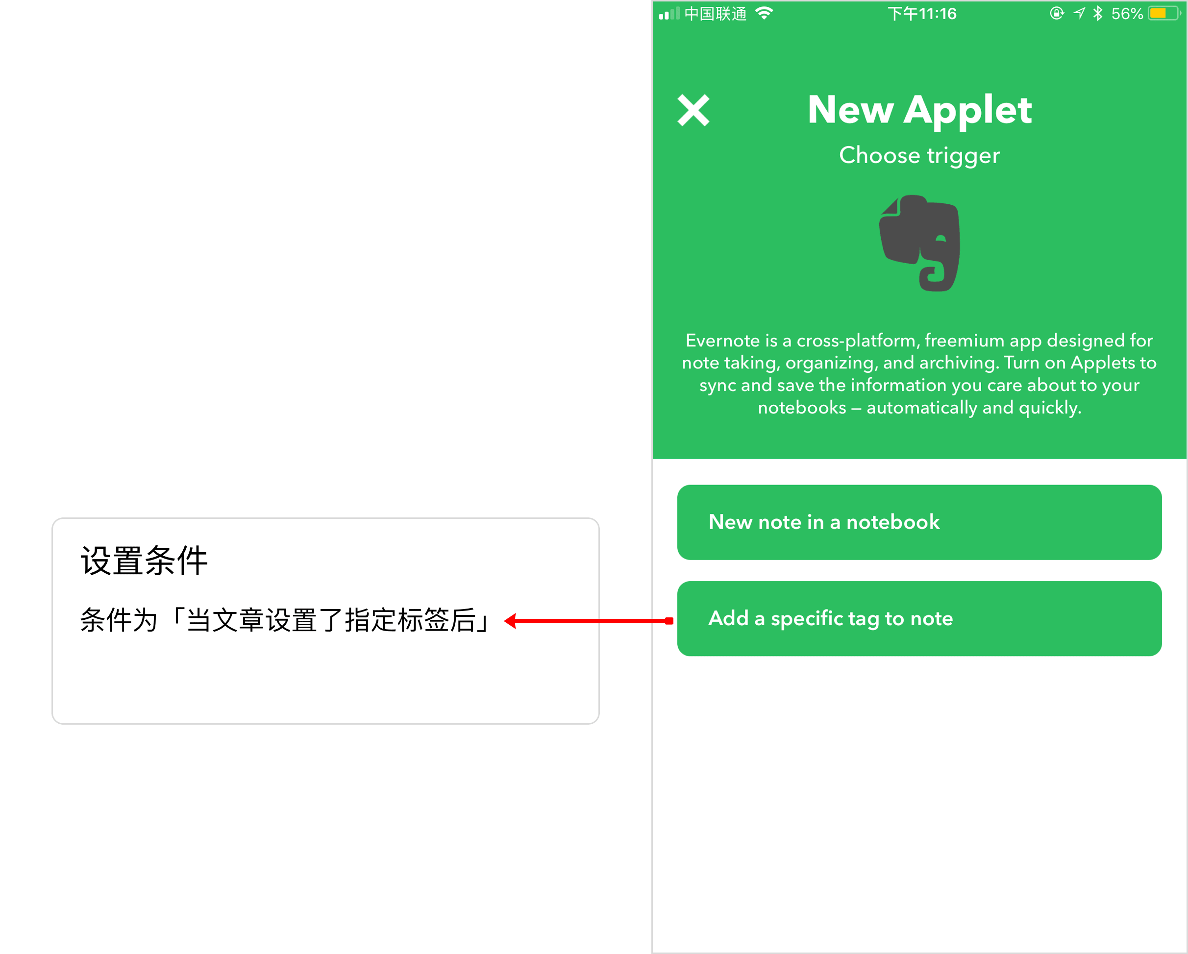 IFTTT 设置「条件」为,当 Evernote 中有一篇文章设置了「稍后读」标签时。