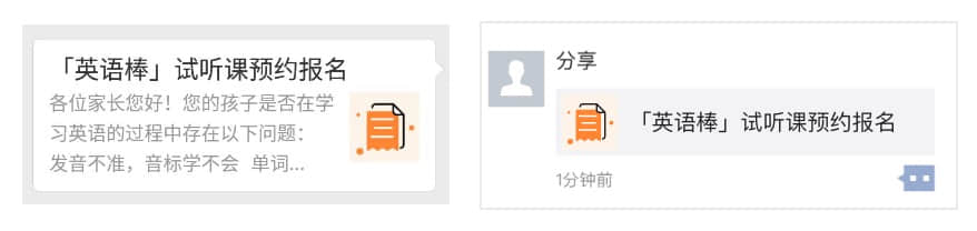 比如,我们在上一章中提到的「英语棒试听课预约报名」表单,如果我们什么都不做,那么分享到微信后,会默认将表单的名称作为分享标题,别人看到的是这样的: 我们自己设身处地地想一想,如果刷到这样一条信息,会愿意打开看看吗?并不是说我们要变成标题党,但是我们好不容易让表单曝光在了用户面前,如果他们没有进一步打开,那就太可惜了。因此,针对表单传播的图标和文案的优化,是非常重要的。