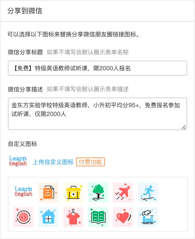 别人在朋友圈、群聊中看到你分享的表单后,最直接影响他们是否会打开的因素,就是图标和文案。如果你的标题能成功地引起他人的兴趣,那么他们就更愿意点进来看看。