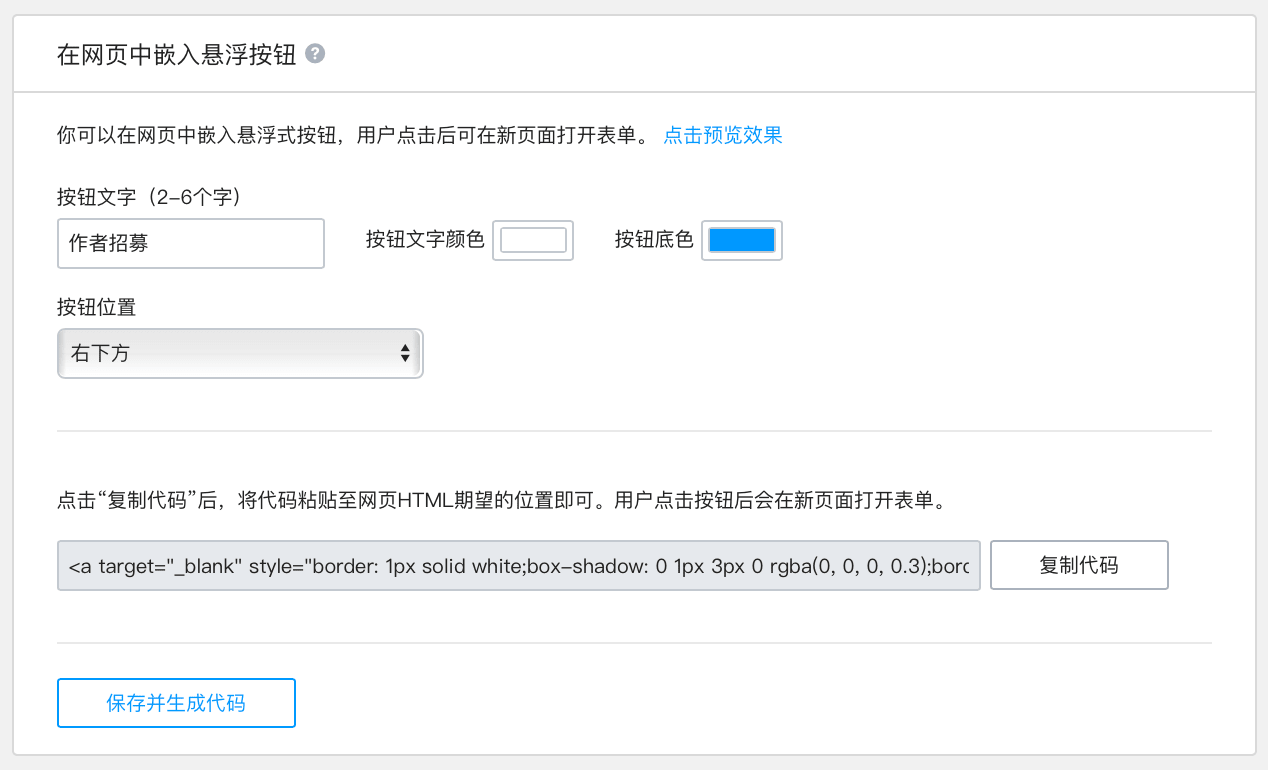 这样的悬浮按钮始终固定在网页的特定位置上,足够醒目。另一方面,它完全不需要借助任何设计,你只需要在金数据中一键生成现有的代码,让前端人员复制粘贴到网页的源码中就可以直接使用了。