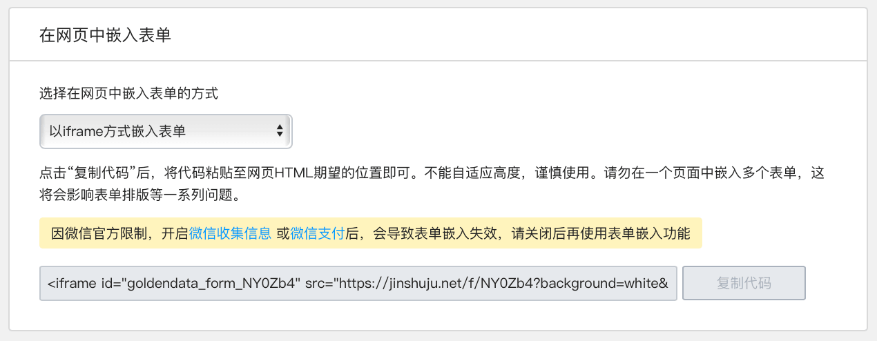 金数据就提供了网页嵌入的功能。以这个「明道OKR实施内训服务」为例,在前面提供了课程介绍、讲师介绍等信息之后,网页的最后一屏,直接嵌入了一个金数据的咨询表单,使用户可以在浏览课程的过程中,无缝提交表单。 要做到这一点也非常简单,和加入悬浮按钮一样,金数据都可以一键生成代码,直接粘贴到现有网页的某个位置就可以了。这里金数据提供了两种方式:script 和 iframe,后者的高度是固定死的,不能根据表单的长度变化而自适应,所以推荐大家使用默认的 script 方式即可。不过,需要注意的是,如果你在表单中开启了微信收集信息或微信支付功能,就无法使用网页嵌入了。