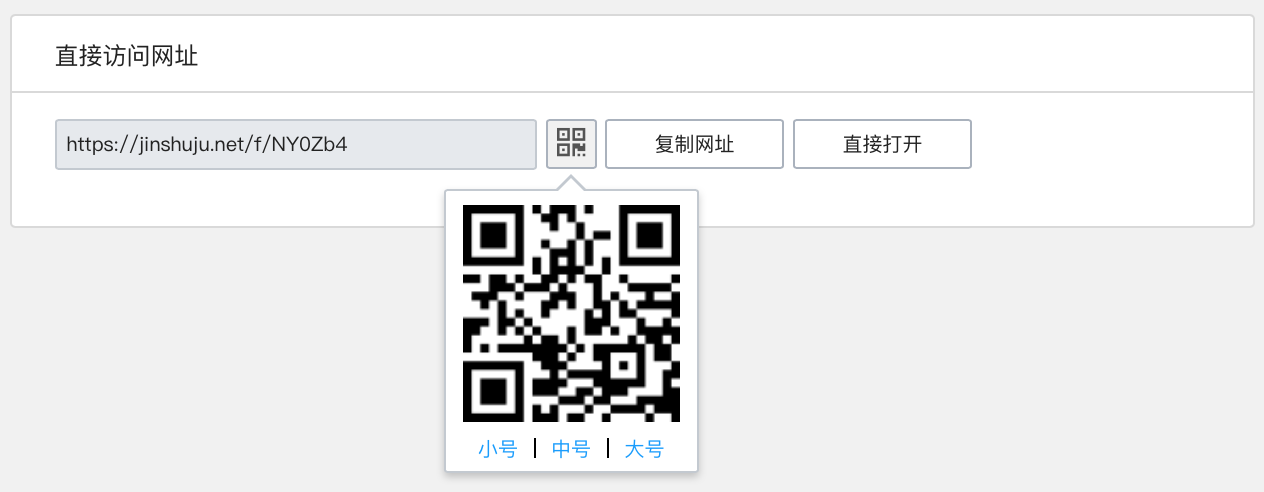 前面已经提到了,一个表单就是一个独一无二的链接,不过,在微信公众号的传播上,微信对链接的开放是有限制的,更多时候我们需要将链接转化为二维码,再引导用户长按跳转。金数据中直接帮你把链接转化成了二维码,并提供了大中小尺寸的下载,免去了你自己生成二维码的麻烦。
