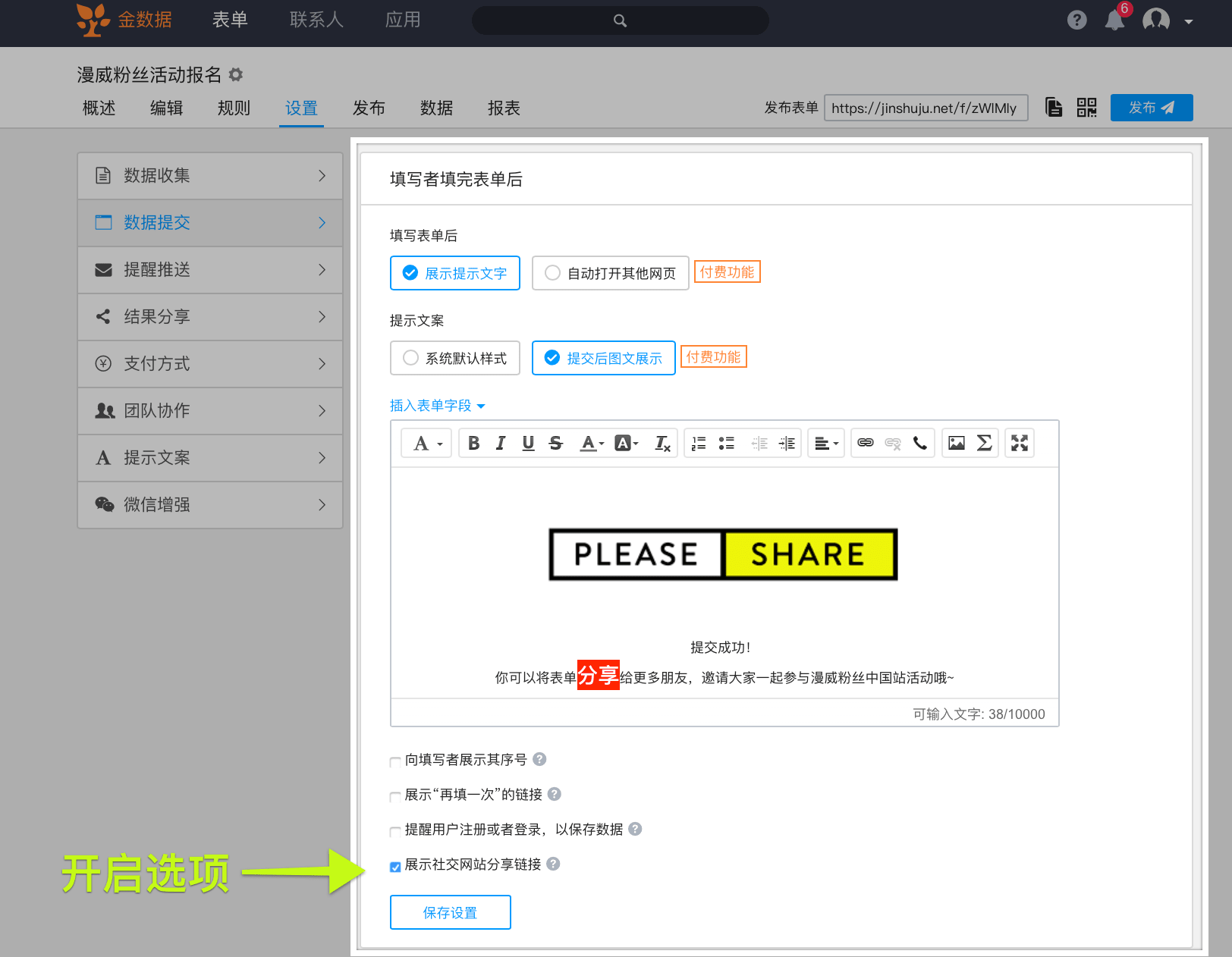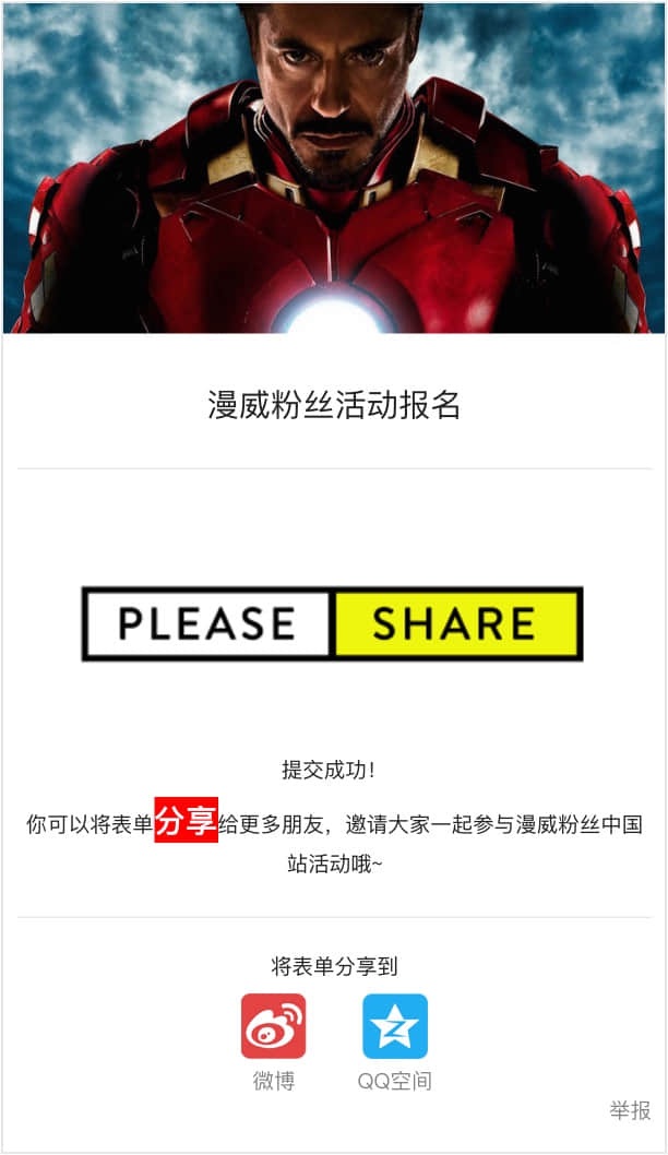 除了在自有渠道和微信渠道投放表单外,另一个非常重要的曝光来源,就是用户社交关系传播。在用户填完表单后,你可以引导用户将表单分享给他的朋友。例如,在漫威粉丝活动报名的表单中,只要用户填写完成表单,就会展示分享引导页。 要做到这一点并不难,在「设置 - 数据提交」下,你可以配置表单提交后的提交文案,提醒用户分享给自己的朋友,并且开启「展示社交网站分享链接」的选项,就可以了。如果你自己有开发能力,想展示更丰富的分享引导页,还可以选择填写表单后「自动打开其它网页」,跳转到你自己开发的分享引导页。