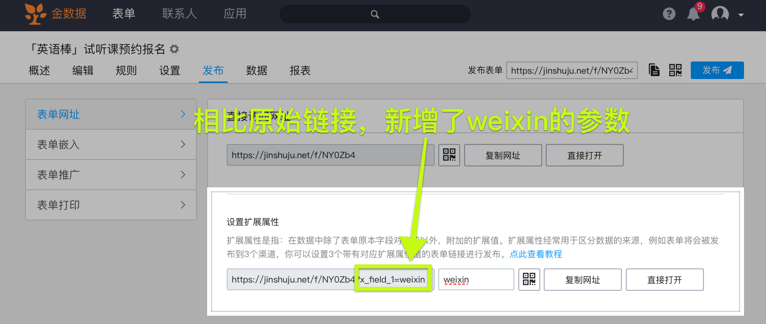 其实,不需要通过金数据的这个界面,你只需要在任意表单链接后,按如下格式,就能无限制地生成带有扩展属性的链接。