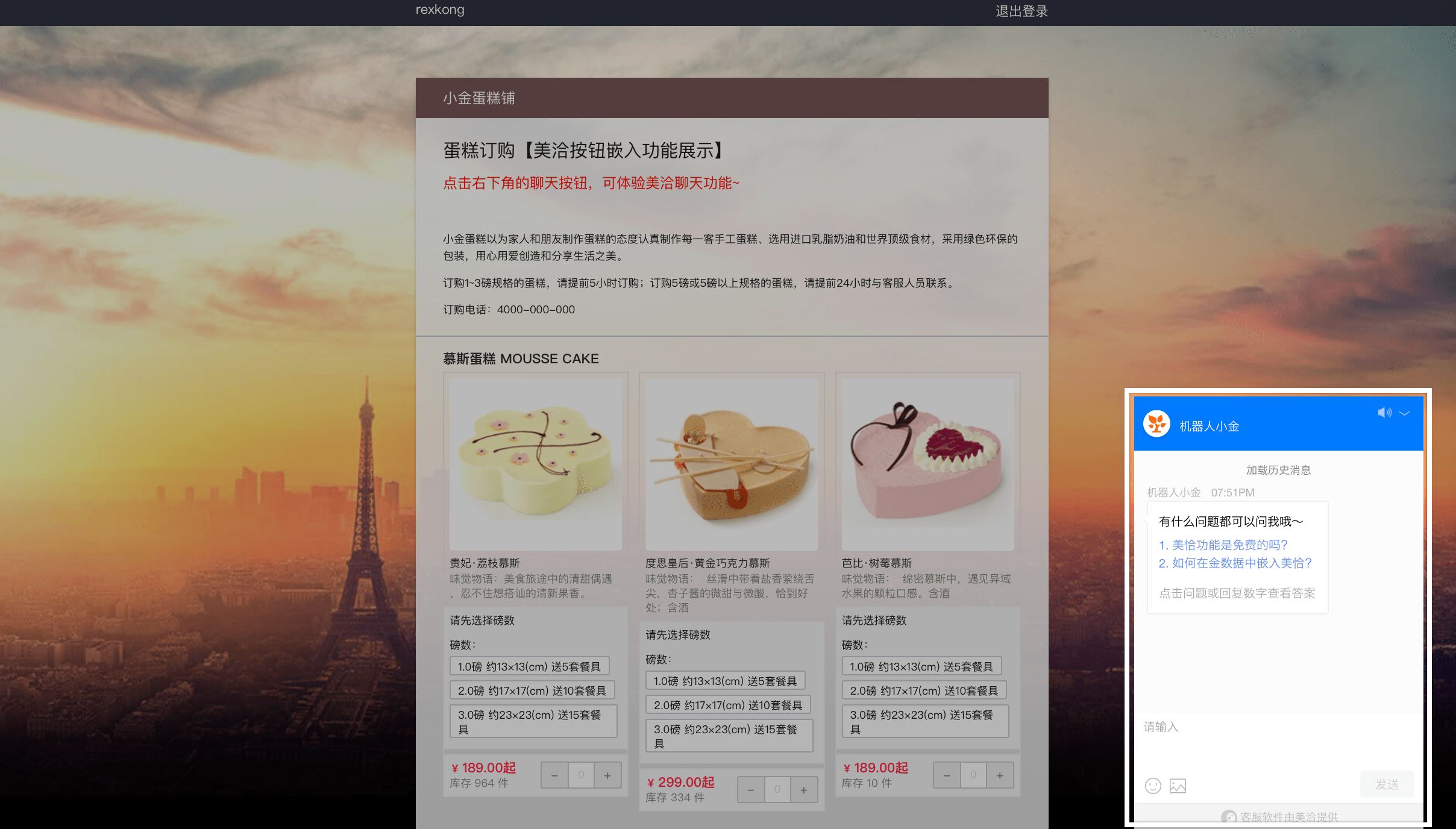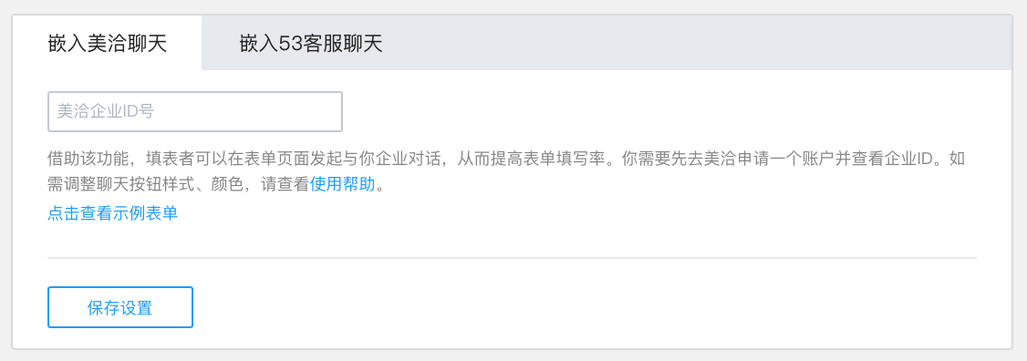 以蛋糕订购为例,常规的蛋糕尺寸只有 1–5 磅可选,如果用户想订更大的蛋糕,该怎么办?就像在淘宝中购物一样,我们常常需要咨询店铺小二,金数据也可以结合第三方客服工具,在表单中集成客服能力。 目前,金数据支持无缝接入美洽和53 客服,和绑定友盟这样的第三方统计工具很像,你也需要注册这些第三方客服工具平台,最终在表单的设置中,填入关联的 ID 号码,即可在表单内让用户可以直连机器人或人工客服。你可以在这里查看金数据提供的详细操作步骤引导:接入美洽、接入 53 客服。 金数据目前支持接入美洽与 53 客服两家第三方客服工具