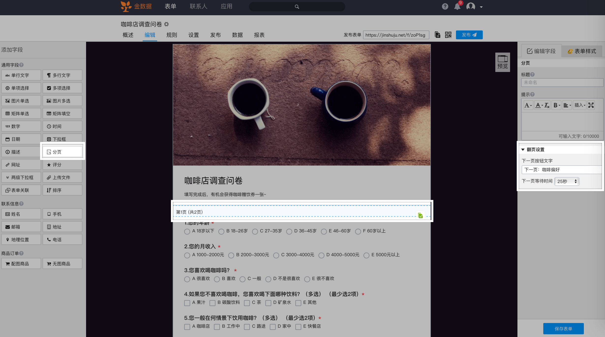 其实,你可以通过合理分页,把整个问卷或表单合理分割成几个部份,从而降低用户的心理压力。例如,一家即将开业的咖啡馆为了了解顾客的偏好,现在希望周边的人填写「咖啡店调查问卷」,题目主要分为两类:收集顾客的基本属性特征,了解顾客对于咖啡的偏好。 这时候,就可以借助金数据将表单分为两页。分页后的表单,用户会看到表单总共的页数,并且必须一页一页完成填写,最后才能提交。为了增强用户的心理感知,你还可以自定义跳转到下一页的按钮文字,写明下一页的表单问题类型,如「下一页:咖啡偏好」。
