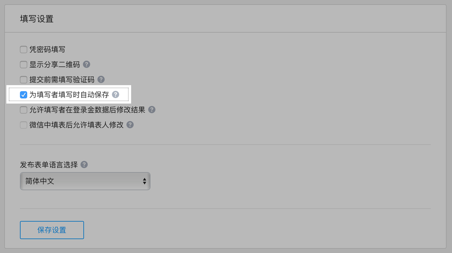 如果再次回到表单,之前填过的内容都不复存在了,要重新再填一遍,相信许多人就放弃了。金数据在「设置 - 数据收集 - 填写设置」中提供了一个选项「为填写者填写时自动保存」。只要在同一设备上,并且表单还没有提交,这时关闭再进入表单,之前填写的内容都会原封不动地保存着。这样,不给会填表人深深的挫败感,他们也愿意在原先的基础上把表单填完。