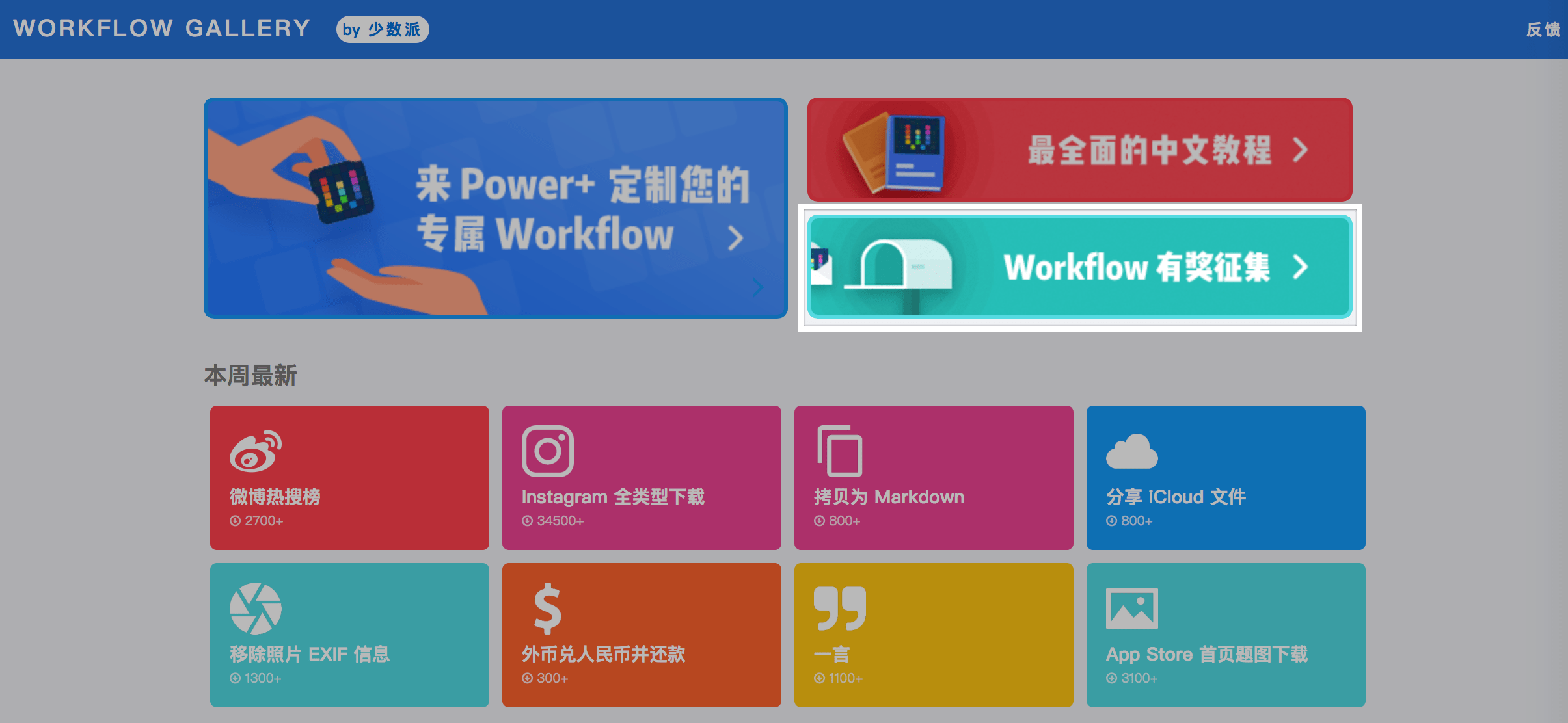 每一个表单都是一个独一无二的链接,这恐怕是最直接的方式了,在你的网页上,把按钮、文字或图片的链接,直接链向金数据的表单。以少数派官方站点为例,Workflow Gallery 就支持读者点击「有奖征集」,通过填写表单的形式,提交自己的 Workflow。 (2)悬浮按钮