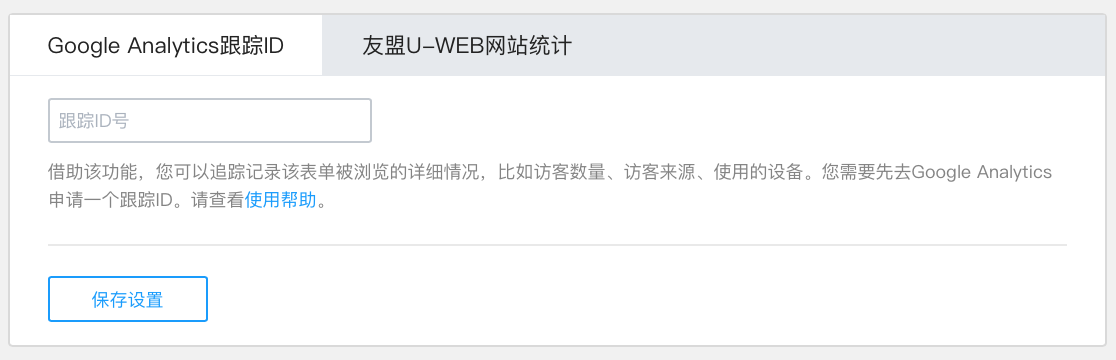 在金数据的「设置 - 数据收集」模块下,支持集成 Google Analytics 或友盟的外部统计工具,以了解表单的访客数量、来源、设备等信息。你只需要去第三方工具中完成注册后,将生成的跟踪 ID 填入金数据的设置,即可在第三方工具中查看统计到的数据。你可以按照金数据提供的详细引导来绑定 Google Analytics或友盟。 这样一来,例如上一节当中,我们把两份内容相同,但标题不同的表单分享到了两个 500 人的家长群,接下来想分析不同标题的 A/B 测试效果,只需要打开第三方工具,就能看到不同标题的表单,各自的打开率了。