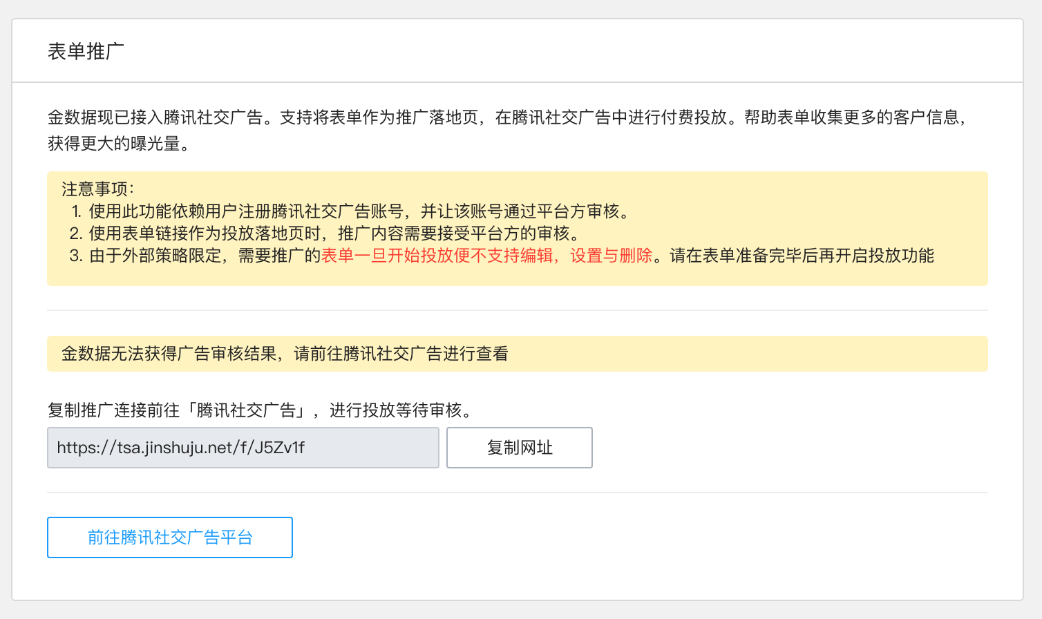 由于腾讯的投放机制需要审核认证的落地页链接才能够投放,金数据作为腾讯社交广告首批认证的第三方合作伙伴中唯一的表单工具,在这里实际上生成的是一个可供投放的特殊表单链接,你需要在腾讯社交广告平台完成注册后,自行将这个特殊链接粘贴到对应的投放当中,你可以在这里查看详细的操作步骤。 (3)金数据小程序:方便在群聊中传播