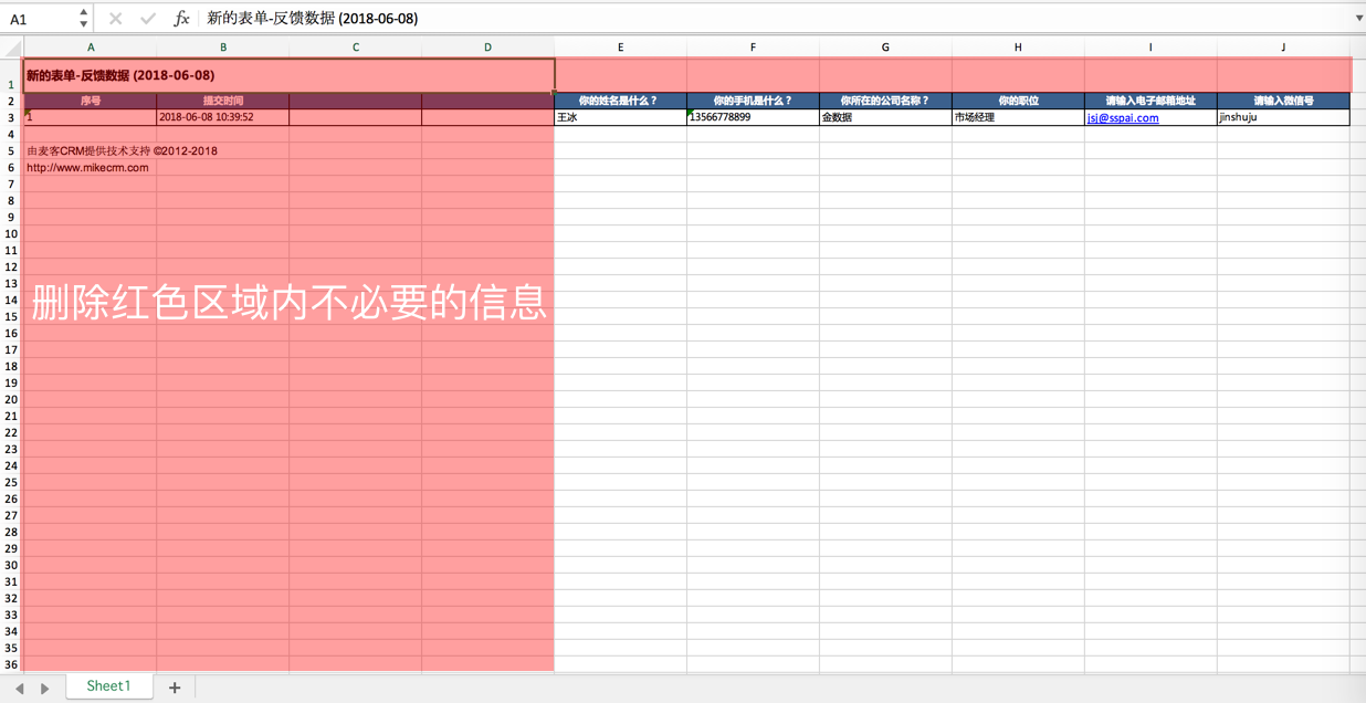 导出的 Excel 文件中,麦客会额外生成一些信息,如表头、序号、说明文字等,先在 Excel 中将这些多余信息删去。