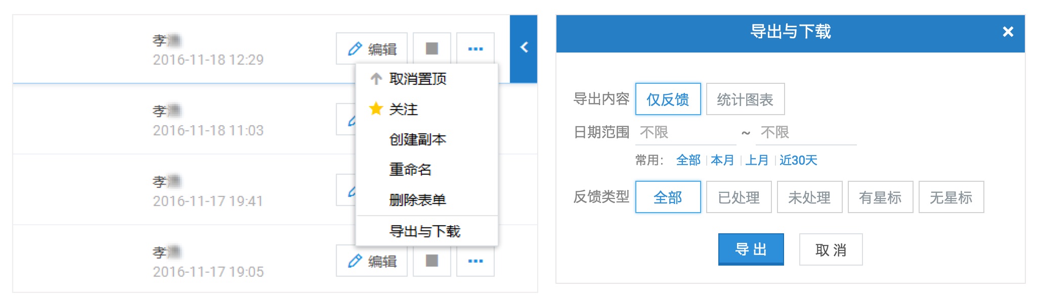 在麦客中,找到你想要迁移的表单,选择最右侧的「…」菜单中的「导出与下载」,并在弹出框中,导出内容选择「仅反馈」。这样导出后,会得到一份 Excel 文件,表单中的问题会作为每一列的标题,每一行都是已经收集到的内容。