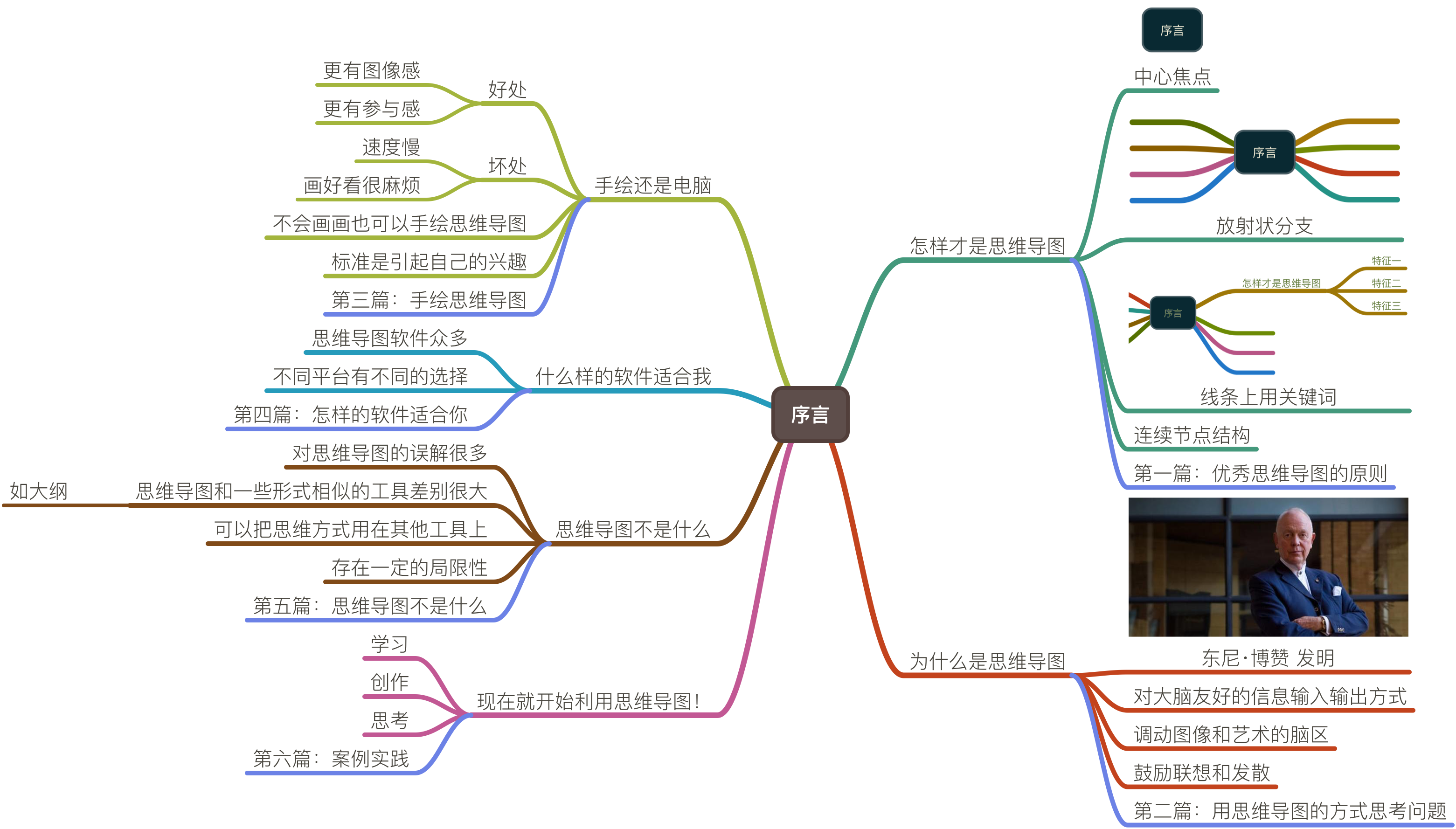 1993 年他首次出版了同名著作《思维导图》,这是一本非常好的了解思维导图的书籍。但由于其「安利」性质,这本书用很多的笔墨讲了思维导图的设计理念,反倒是对于在绘制的时候具体要注意些什么涉及较少。我曾经在初中时候阅读过这本书。当时看到电视里一个记忆力超强的人表演,觉得非常厉害,本来想去买点记忆相关书籍,正好看到这个摆在旁边,就顺便买回来了。结果比起那些我现在基本没怎么掌握的记忆技巧,思维导图给我的帮助要大得多。(Tony Buzan 同时也是世界记忆锦标赛的创始人。)