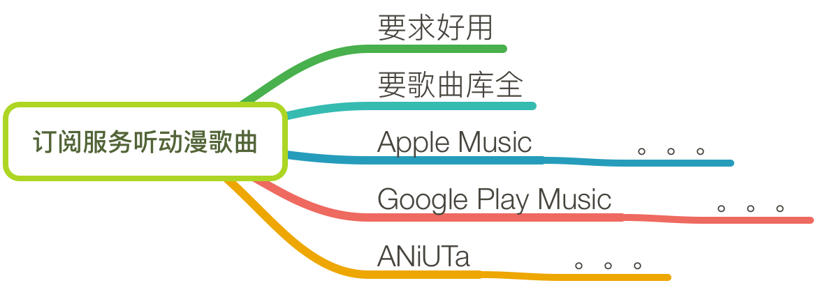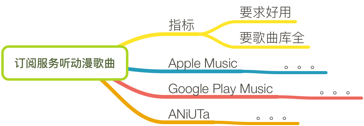 现在思考一下,你是否忽略了导语中可能有价值的信息?对我来说,导语中对于串流服务两个选择条件的描述「既要好用,又要有很全的 Anisong 歌曲库」也属于有价值的信息,但这些信息应该如何加到思维导图中呢?你可能会犯下面的错误: