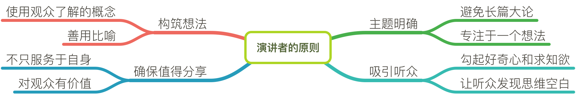 你也许会发现我并没有在思维导图中体现诸如「在你将自己的想法灌输给观众之前,你必须得到他们的允许。」这样表示原因的句子。因为本思维导图的重点主要在「四原则」本身,当然如果你愿意体现这一点,可以在对应的结论下新建一个层级表示出来。