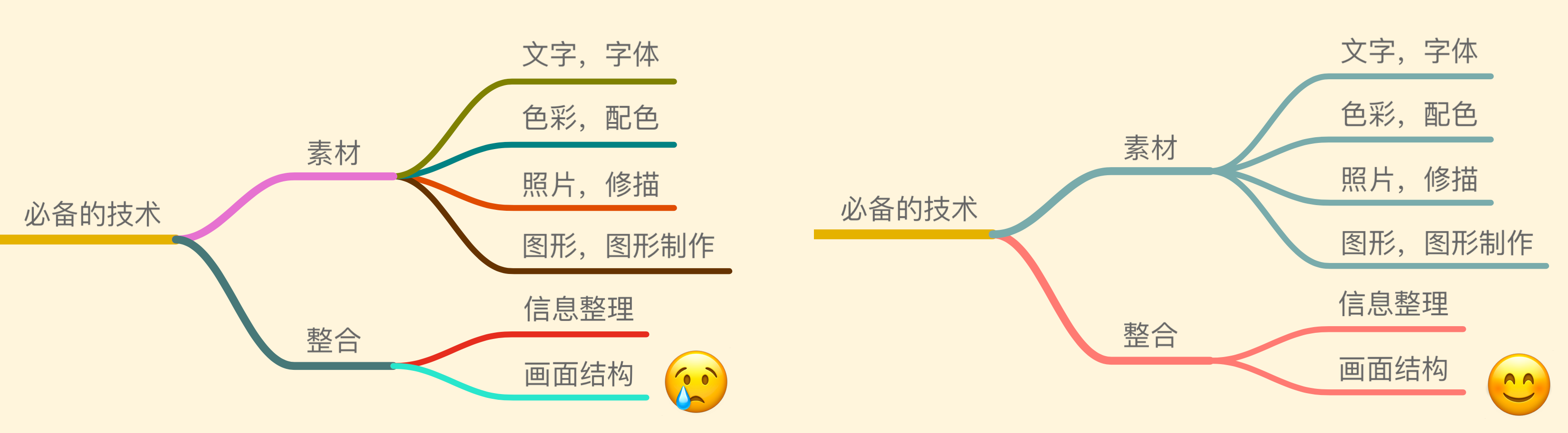 上面这张思维导图或许看起来整整齐齐,但看起来非常无趣。要吸引人,颜色无疑是非常重要的,随便拉来一个小孩给他看内容差不多的画,他大概都会觉得颜色丰富的那个好看。给思维导图添加合适的配色,可以提高它辅助你思考的能力。