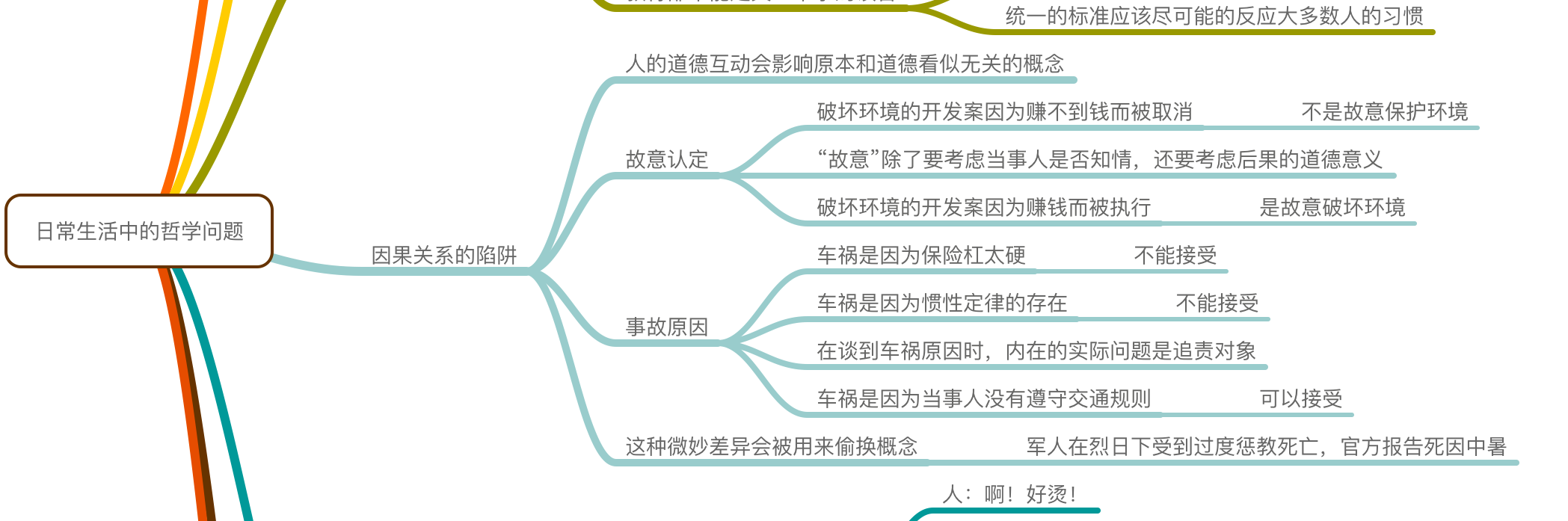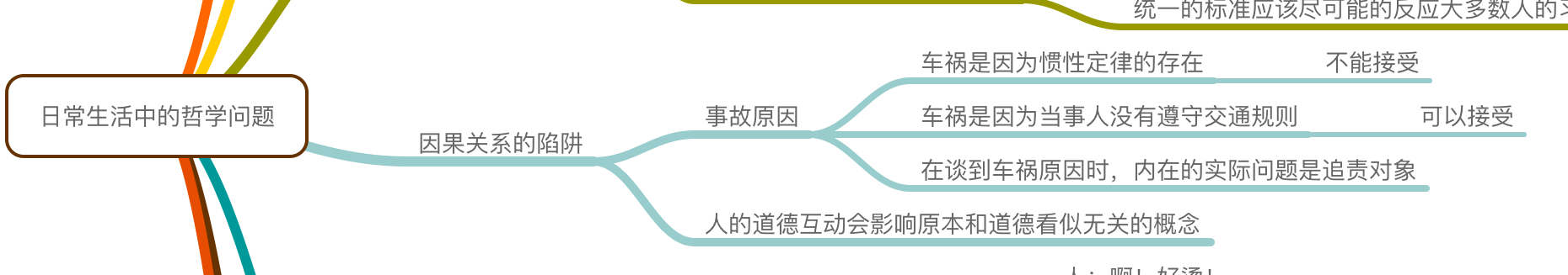 找到问题了吗?这张图里的主要分支之间的关系似乎并不全是并列的。前面三条是一个关于「车祸」的例子,后面一条则是对这种现象的解释,它们不应该放在一起。于是按照我们上面讲的,正确的做法应该是这样: