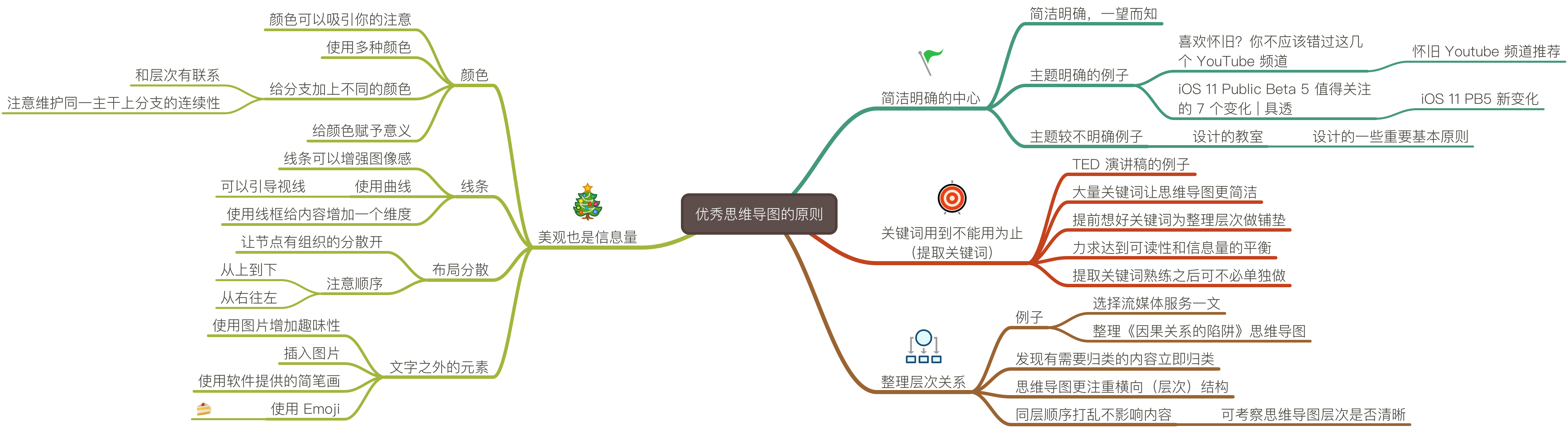 此外,思维导图还更注重横向(层次)结构,而不那么注重纵向(顺序)结构,你应该尽量避免用同层条目的上下顺序来表示信息,可以的话将其转化为层级关系。可以试试把同一层条目的顺序都弄乱掉是否依然能表示原来的信息。这是一个简便的考察思维导图层次是否清晰的方法。