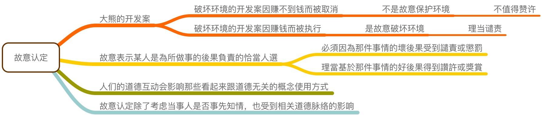 首先是第一段对故意的解释,我们可以对这个解释做一些精简,并分出层次:故意表示某人是为所做事的后果负责的恰当人选 - 必须因为那件事情的坏后果受到谴责或惩罚 \ 理當基于那件事情的好后果得到赞许或奖赏。(这里的斜杠表示两者在同一层级)然后精简一下最后一句的评价:故意与否的判断反映了人们对于事件的道德回应。