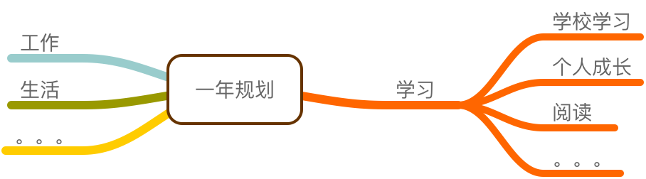 试想你要绘制一个关于今后一年规划的思维导图,第一层的关键词会用来表示什么呢?想必很多人会说是不同的方面。一年的人生规划是一个巨大的问题,当我们要去解决这个问题的时候,首先应该想到的就是把这个问题拆分成多个方面,比如说工作方面、学习方面、生活方面等。而当我们针对某一个方面进行分析的时候,其实也是把这个方面变成一个个的小方面。比如学习方面可以有学校学习、个人成长、阅读等。