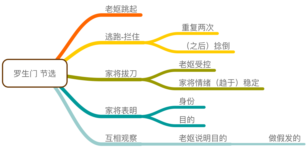 其实刚才我们在做的事情,就是找出这篇文章的思维导图前几层应该写的东西,即文段的主体。现在我们对文章的逻辑稍加整理画成思维导图,你还可以在后面的层次中加入关键词没有提到的人物的神态特征等内容将它补充完整。