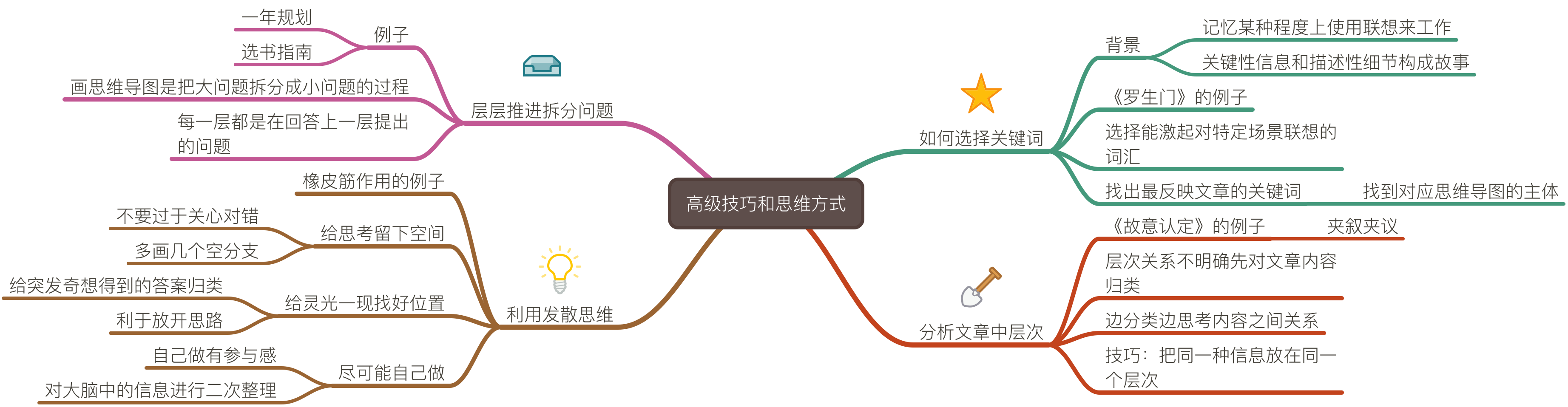 这就构成了叙述部分思维导图的第二、三、四层。可以看到处在同一层的信息都是同一种信息,在处理结构类似的内容的时候我常常这么做。