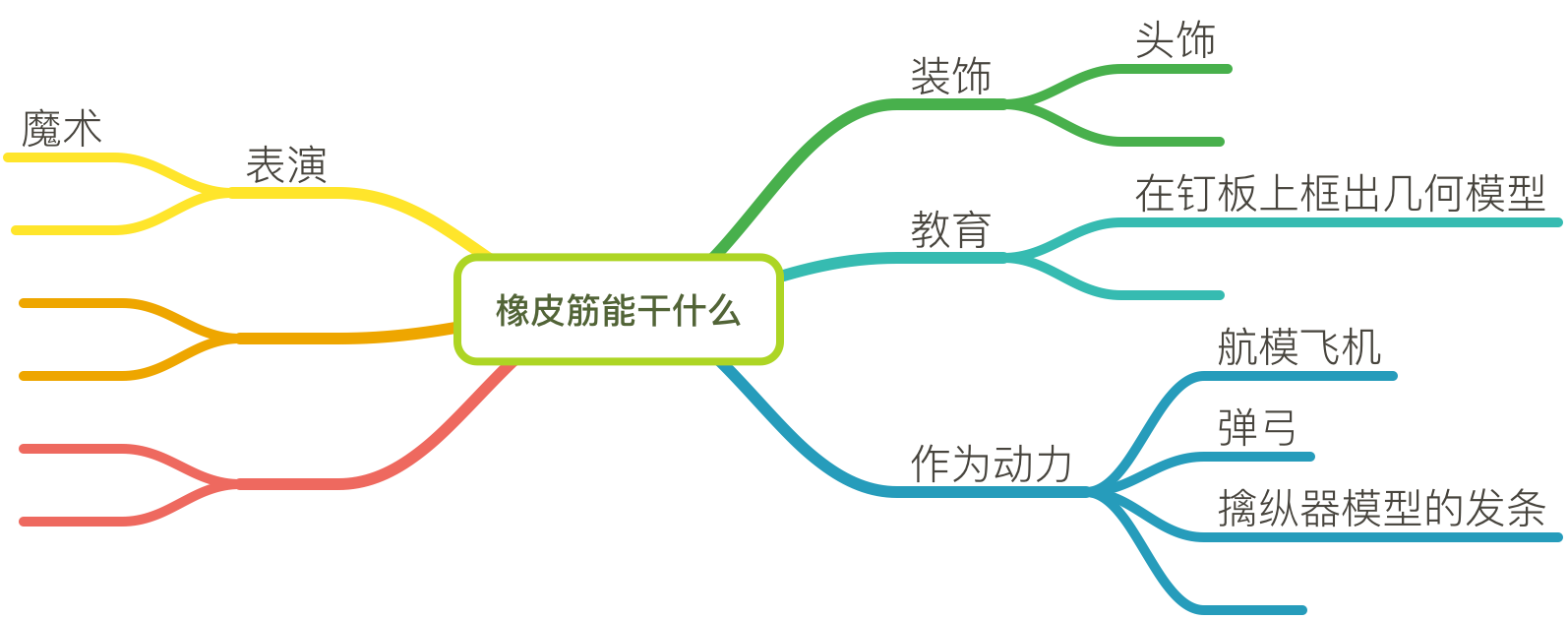比如我想到了橡皮筋的作用有一个是「驱动模型飞机」,就应该想想它属于什么分类,比如「提供动力」。那么在思维导图中我们就应该建立一个「提供动力」作为第一层分支,并把「驱动模型飞机」写到里面去。这样的好处是非常明显的,直接思考橡皮筋的作用会很难放开思路,但一旦我们把所有的答案加入分类,就可以以分类为基准进行二次发散,比如就可以想还有什么用橡皮筋提供动力的情景。假如每个分类都得到了更全面的答案,整体也就能得到更全面的答案。