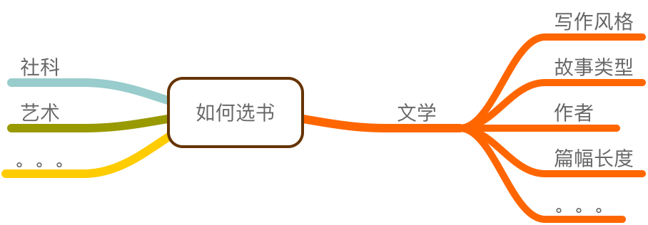 我们来换一个练习的例子,我还不想公开我的一年计划 。「如何选择一本我想看的书」是一个很大的问题。书有很多类型,我想应该分类型来谈如何选择,那么在画这个思维导图的时候我们就可以先问自己一个问题:书这个概念可以拆解成哪些类型呢?如果问我的话我可能会回答:文学、社科、艺术等。完成这一层分类之后我们来单独看第一个文学,选择文学书都有哪些方面需要注意呢?我会回答:写作风格、故事类型、作者、篇幅长度等。像这样通过层层拆分就可以把我们脑中飘忽不定的思维用思维导图的方式呈现出来了。