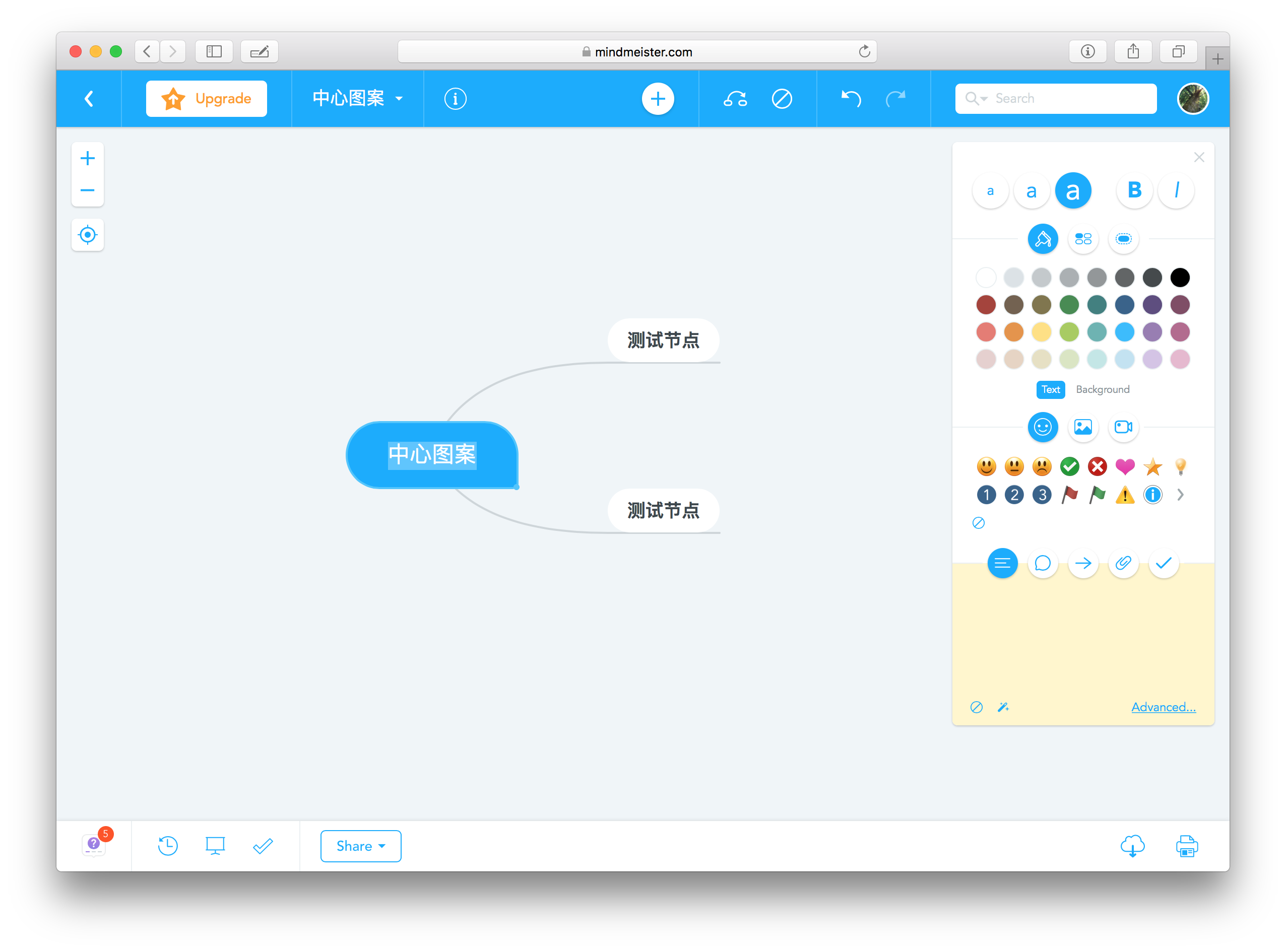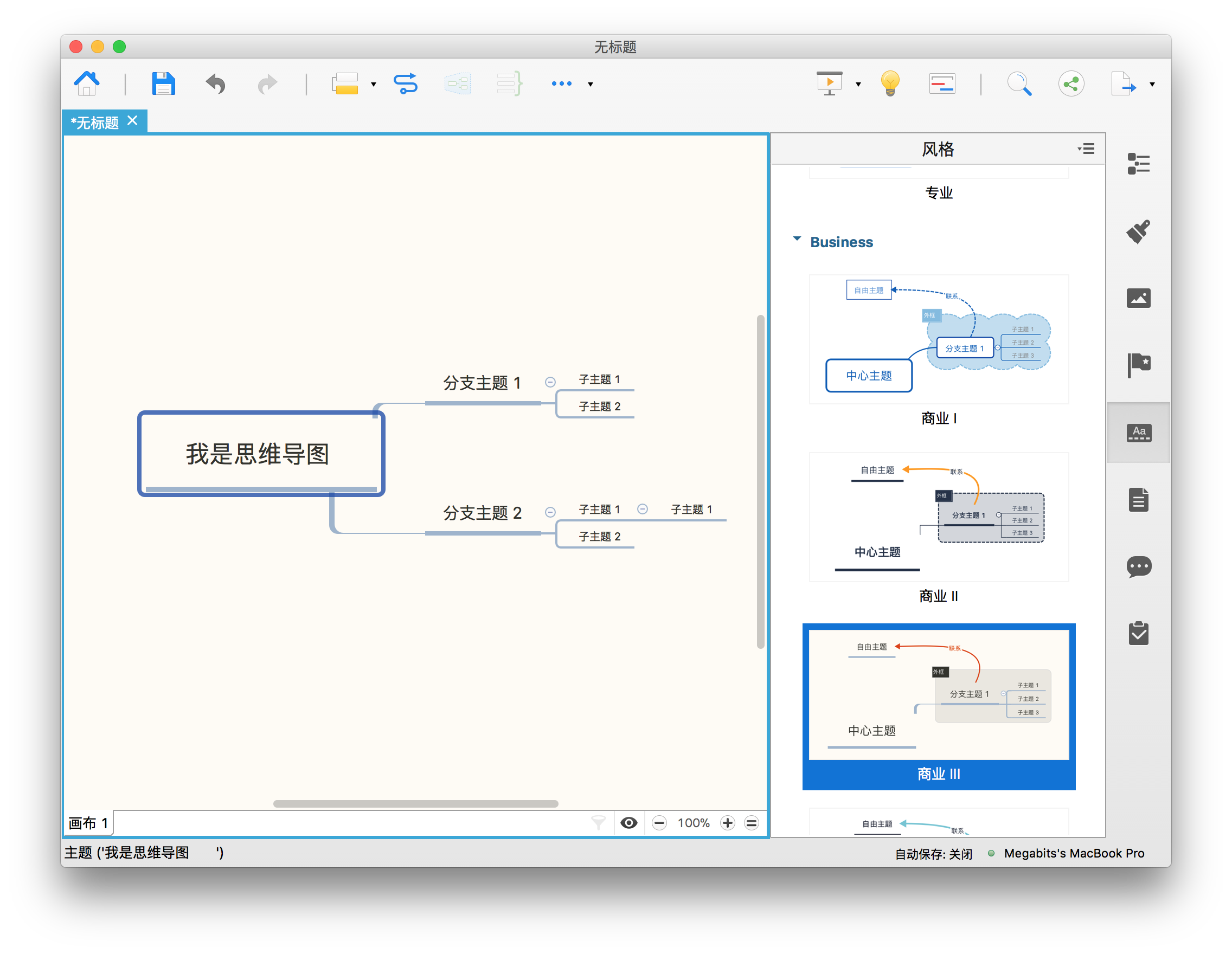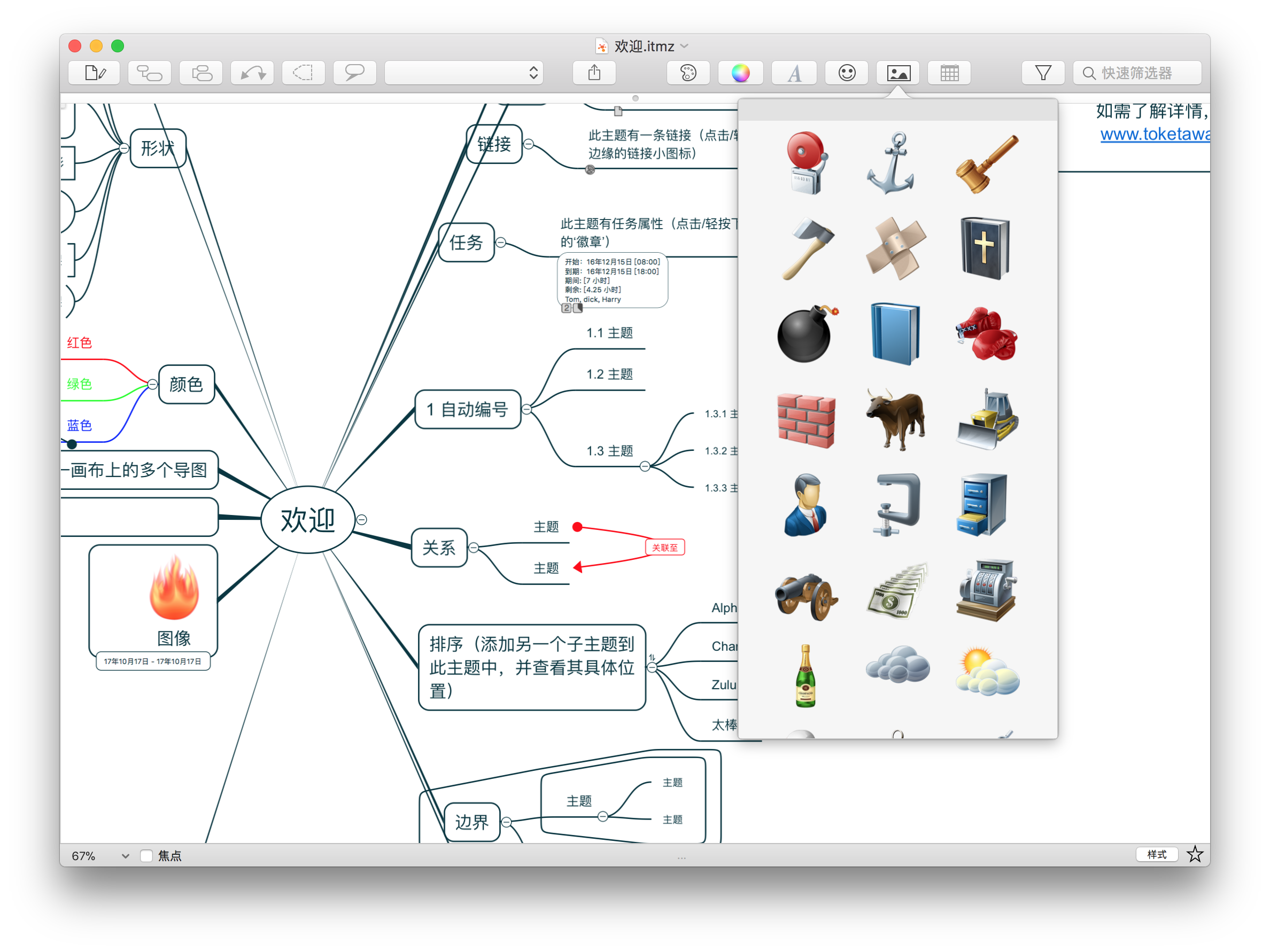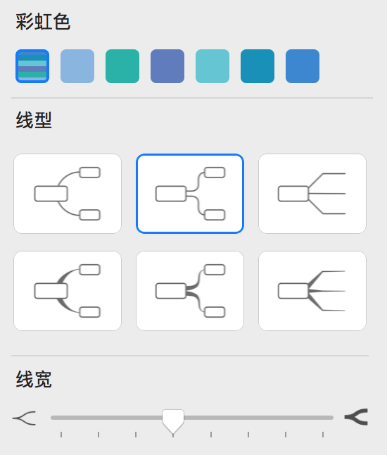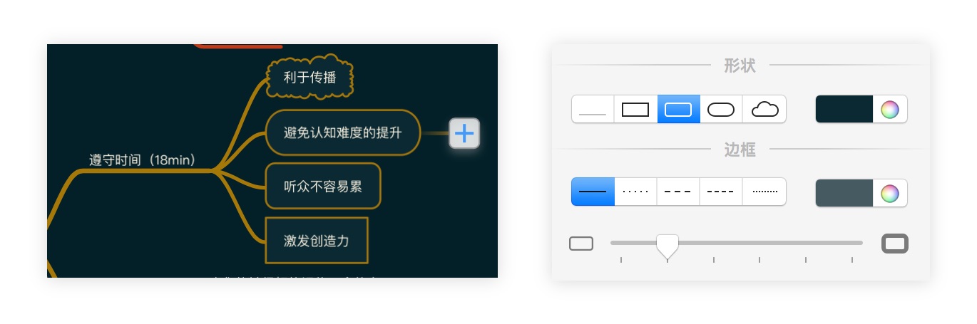 工具栏设计:软件在工具栏上提供了很多功能的入口,相比 MindNode 而言,很多功能的访问要方便很多。