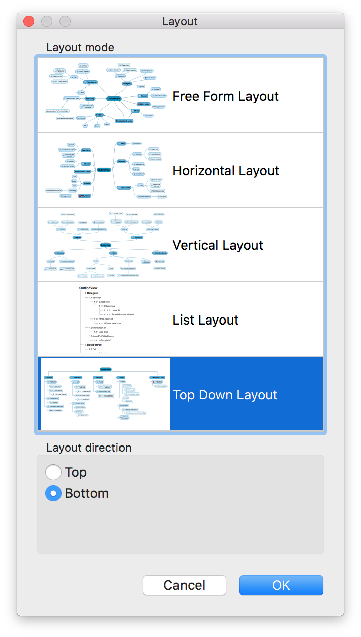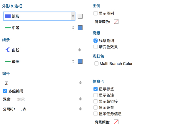 MindNode 的交互设计按照 macOS 上常用的「内容-检查器」设计,类似于 iWork 等常用软件的使用习惯,也非常容易上手。功能众多却不显臃肿。配色等非常现代,各个都很漂亮的模版可以给用户省去很多调整外观的时间。