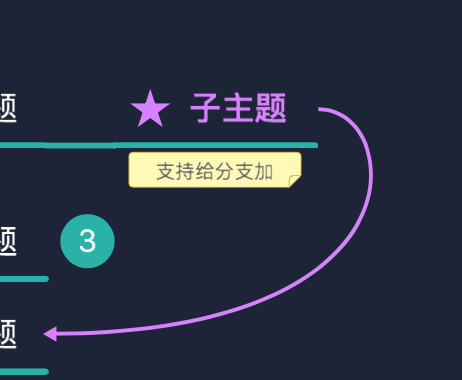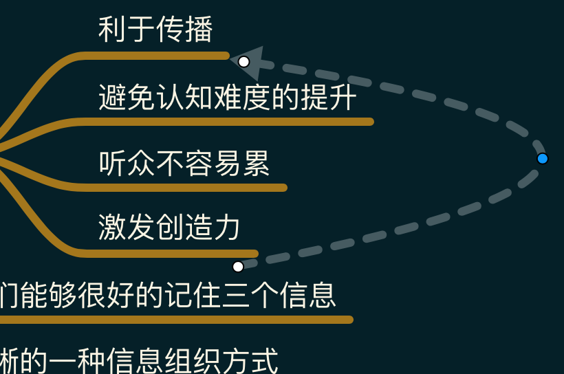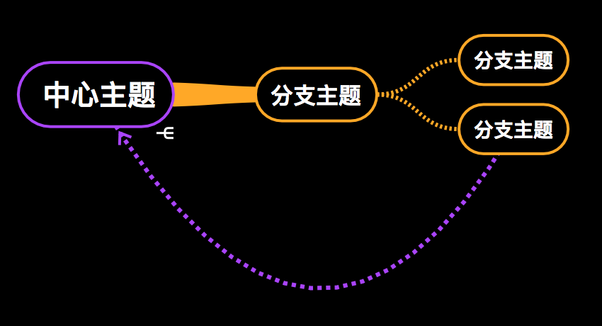 自由连接功能是指用诸如虚线之类的东西连接任意两个关键词的功能。有时候我们的思维导图中不止有一层一层发散的分支关系,处在不相邻的分支中的两个关键词也可能有一些特殊的联系,这个时候我们就可以用虚线或者箭头把这些东西连接在一起。这是一种对思维导图逻辑表示功能的补充。