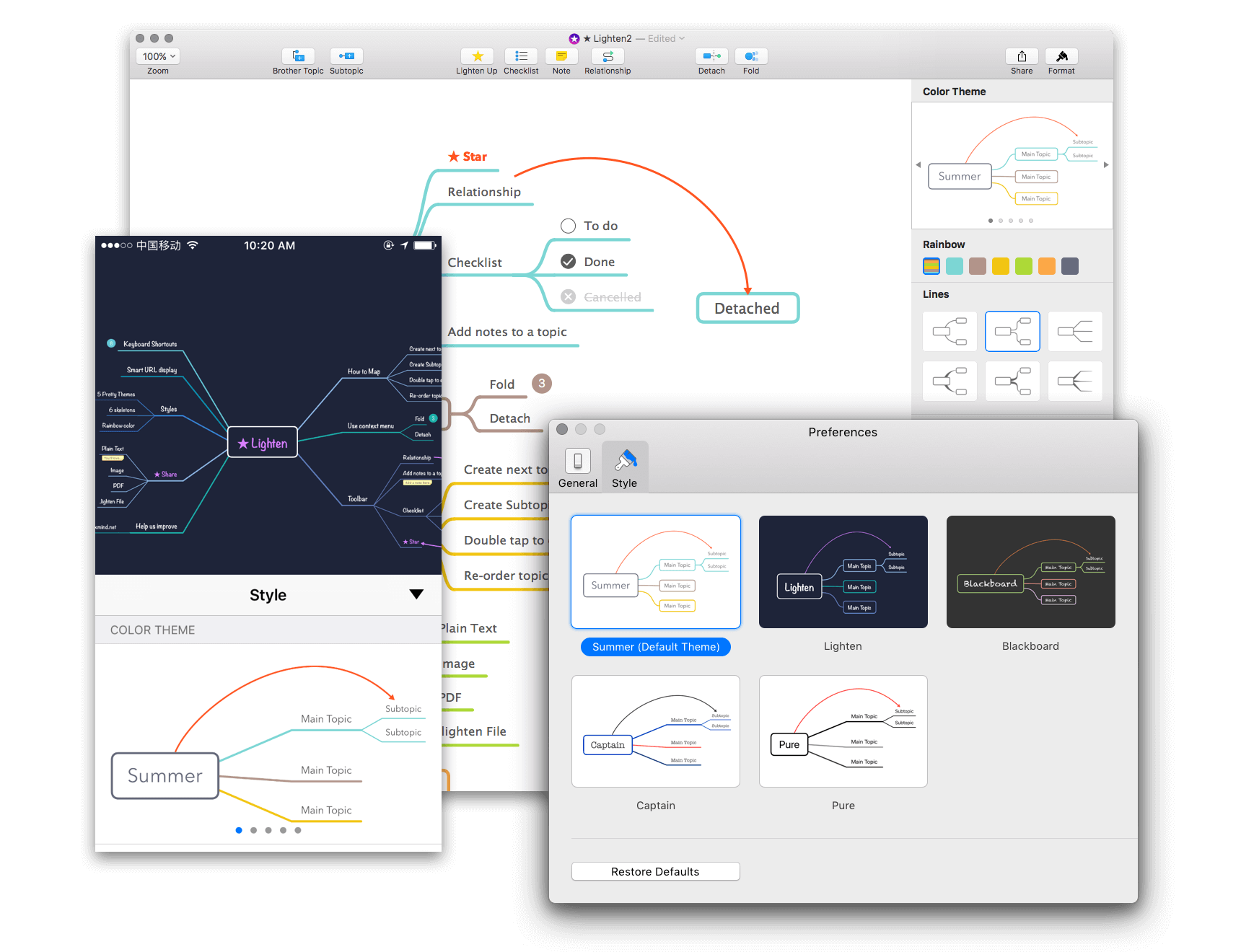 从设计角度讲,这款软件的模版也是非常好看的,也属于那种不需要用户在设计上下功夫的软件。但是 Lighten 做的可能有点过了。从刚才的说明来看,软件的限制非常的高,很多的地方都不能自由修改。对于思维导图轻度使用者来说,这样的软件也许是 MindNode 一个不错的便宜替代,但是对自定义要求高的用户用这款软件就会感觉非常的奇怪。虽然是同一个团队,但这款主打设计的软件确实和自由度很高的 XMind 差别巨大。