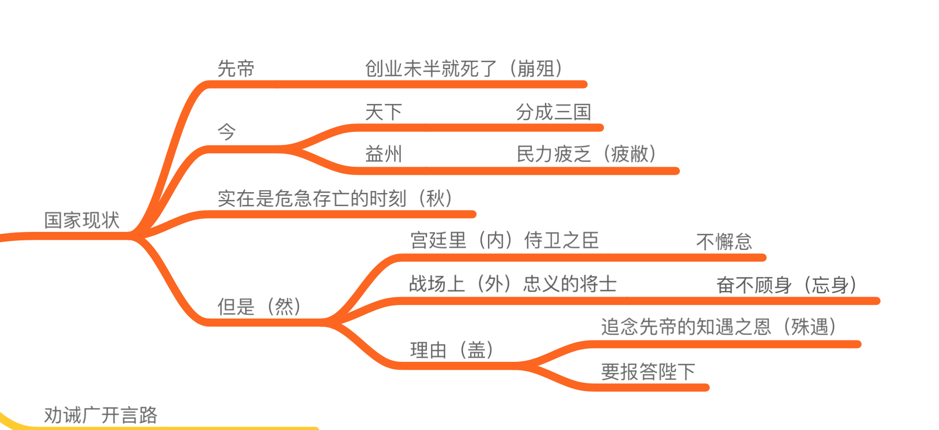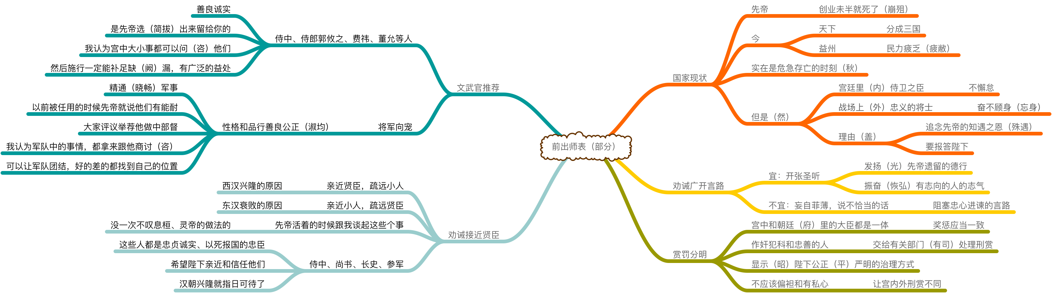 第一个例子我们先来说一个曾经可能让大家头疼过的玩意,背古文。为了减少篇幅占用,我们例子中只讲《前出师表》的前半部分。对于背诵文章来说,首先是对文章的内容进行分析,把整篇文章的内容表示出来。针对古文,在完成了文章内容的分析之后可能还需要标注一些不太容易记住的词汇,毕竟很多词的表示方法不同。