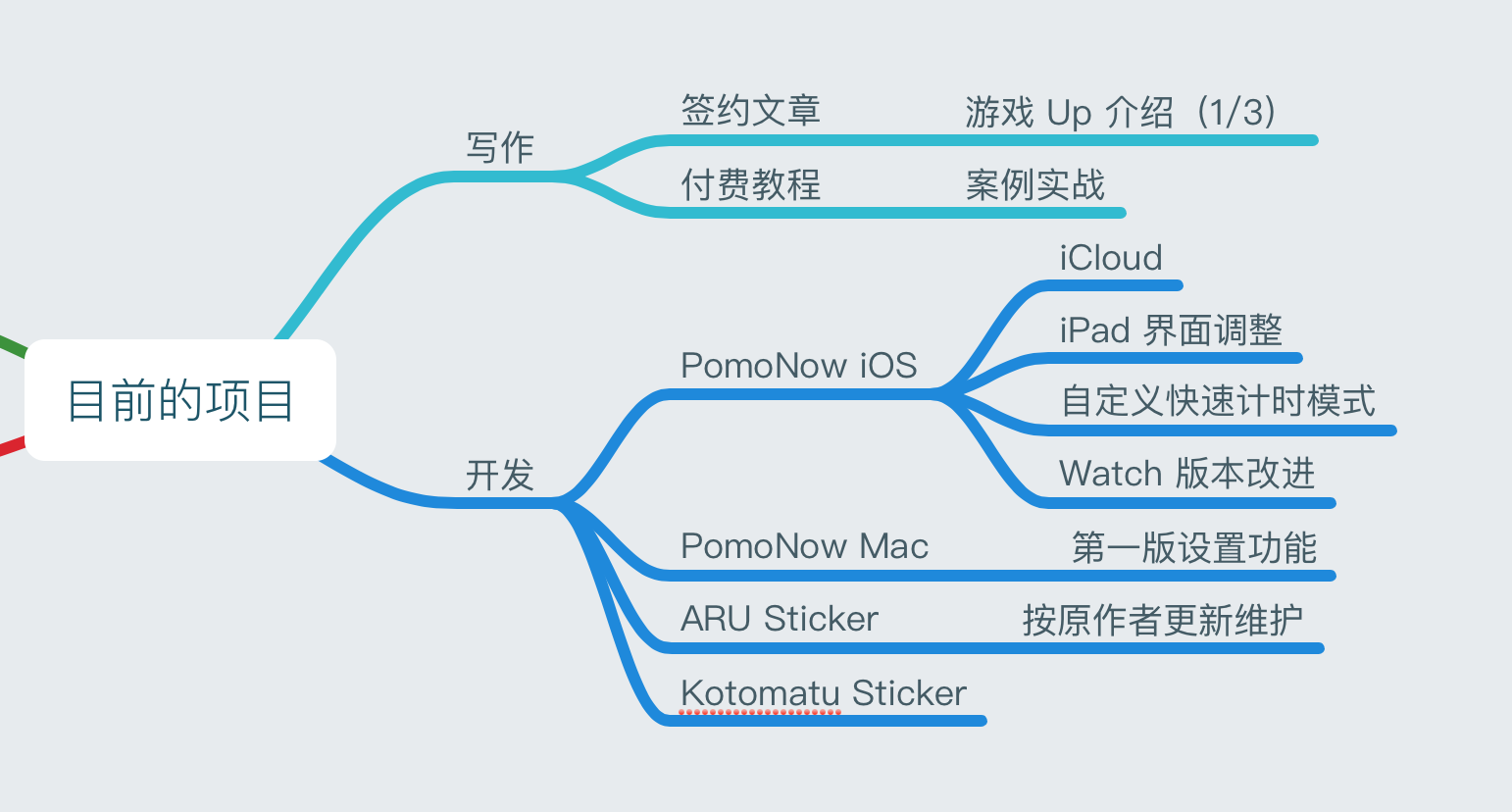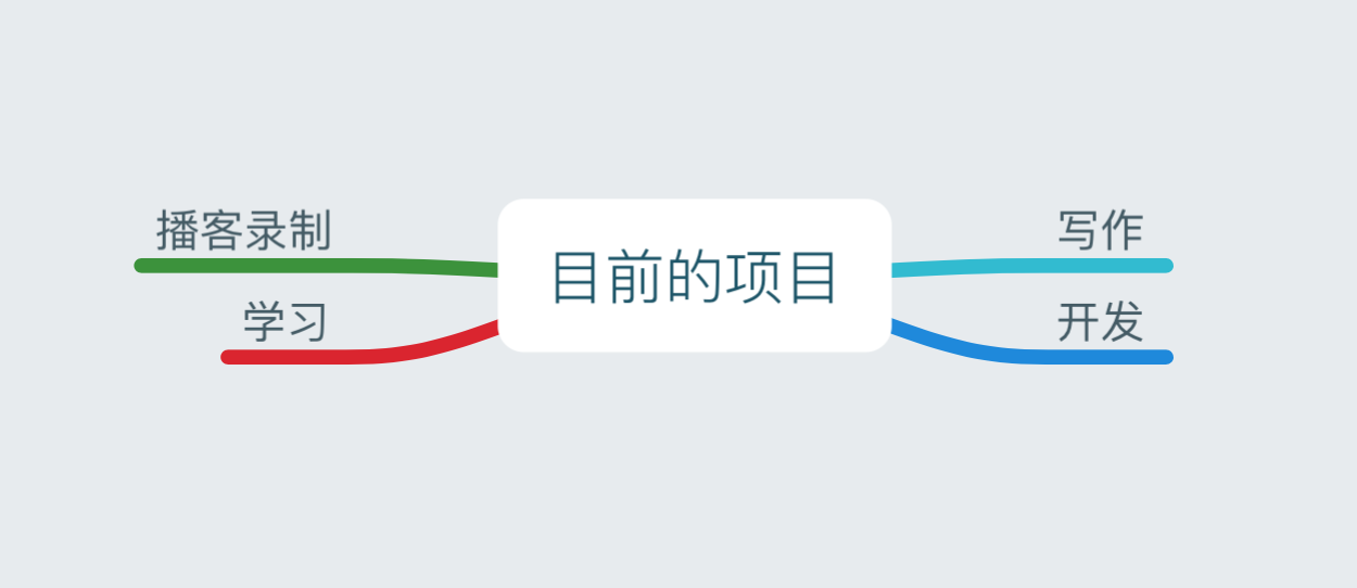 在 GTD 任务管理中有一个「项目」列表,用于整理时间跨度很长的项目,我们这张思维导图要做的就是类似的事情。目的是整理出自己要做的各种各样的工作,搞清楚自己在做些什么。以我自己为例,首先我的工作分为写 App、写作、录播客三部分,而学习主要是日语、英语以及一些 MOOC。于是上层的思维导图看起来像是这样。