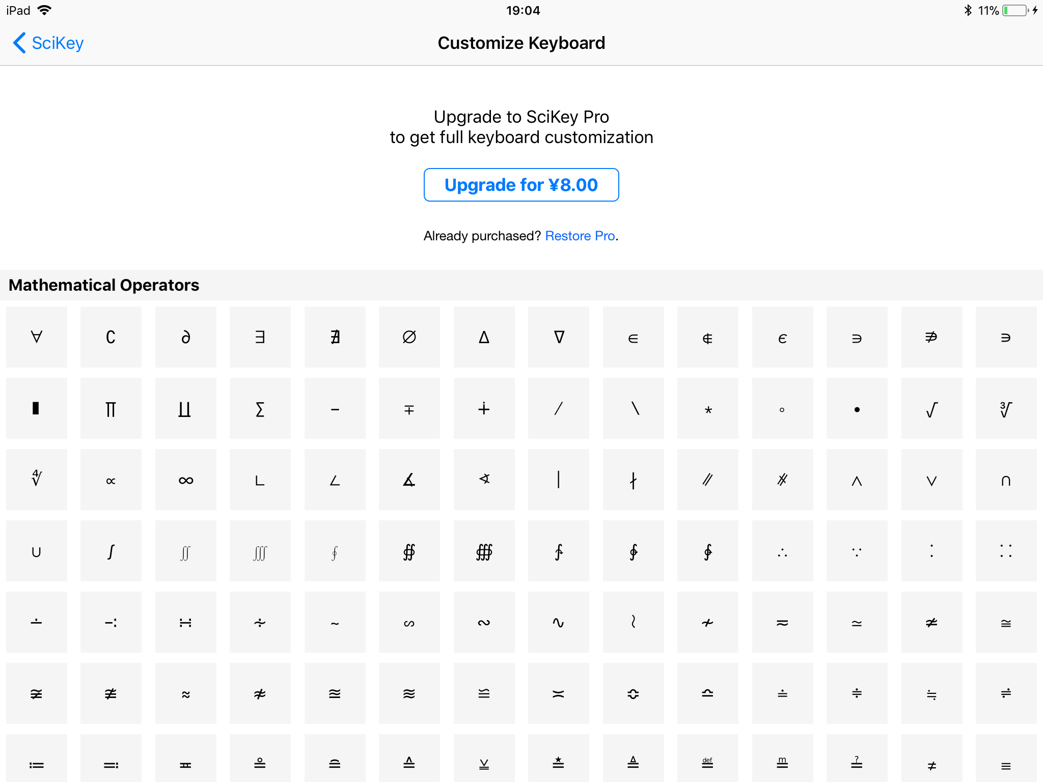 而在 iOS 上,你可以使用一些输入数学符号的键盘,比如 SciKey 这款软件,用的比较多的话,可以用 8 块钱解锁全部数学符号。 也有些比较麻烦的情况,比如含有有长分号的复杂表达式是没有办法正常在一些软件中输入的,比如 MindNode 就不支持插入这样的公式。