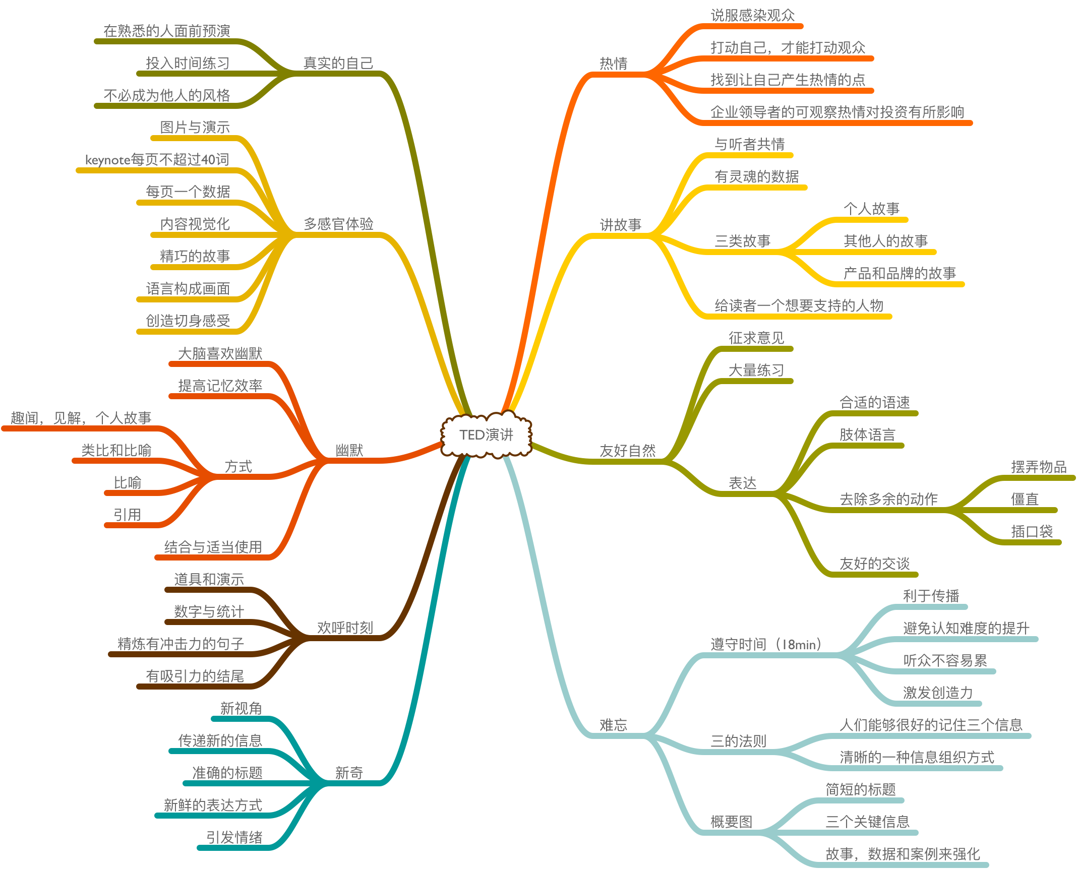 学习还有一个很重要的部分就是读书。对我个人来说,只要阅读的书籍知识性,逻辑性较强,都会选择画思维导图笔记。下图是《像 TED 一样演讲》这本书的思维导图。