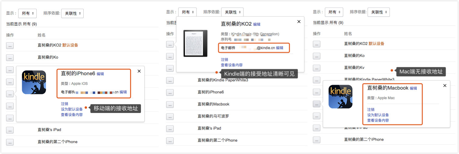 从亚马逊内容管理后台所显示的情况来看,Mac 端是没有接受地址的,就是你们能看到的 xxx@kindle.cn 的地址,而设备端(Kindle全系产品)以及移动端(iPhone、iPad、安卓手机)都是有的,因此我们是无法通过个人文档服务进行内容推送到 Mac 中的 Kindle app 的。
