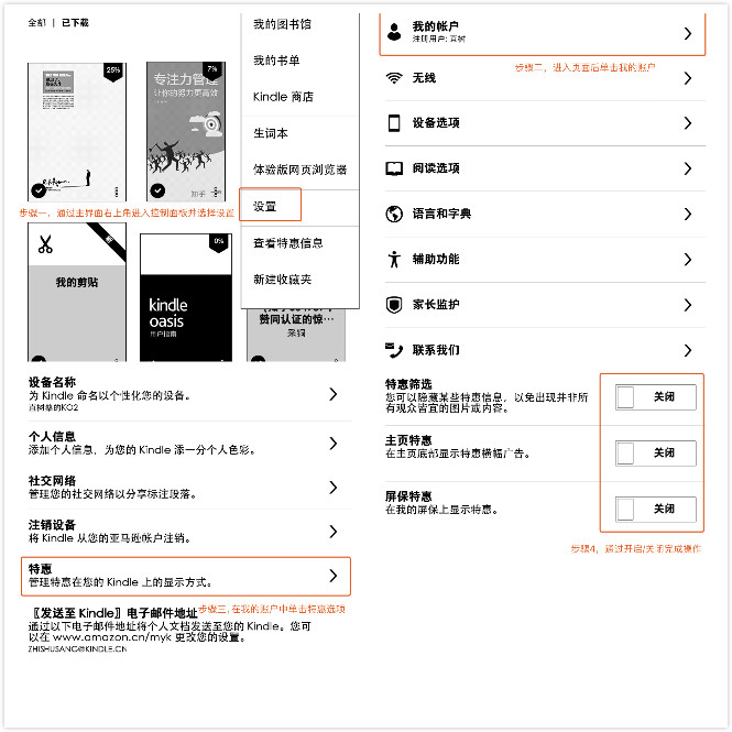 解决这个问题首先要思考,这个广告为何出现?其实,亚马逊 Kindle 上的广告实质是亚马逊向用户推介的特惠信息,主要还是基于你的需求去推荐你有可能喜欢的读物。但相信有些读者对广告会比较敏感而更倾向于自己主动寻找希望阅读的书籍,这也是我比较推崇的方式,所以下面我会介绍下如何「去除」这些广告: