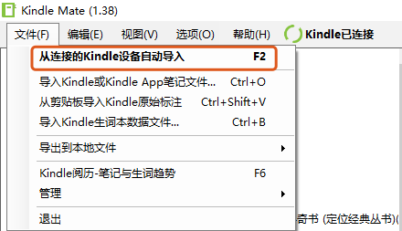 使用 Kindle Mate 非常方便,连接到设备后可直接按 F2 进行快捷同步,当然也可以在文件中的「从连接的 Kindle 设备自动导入」,如下图所示: