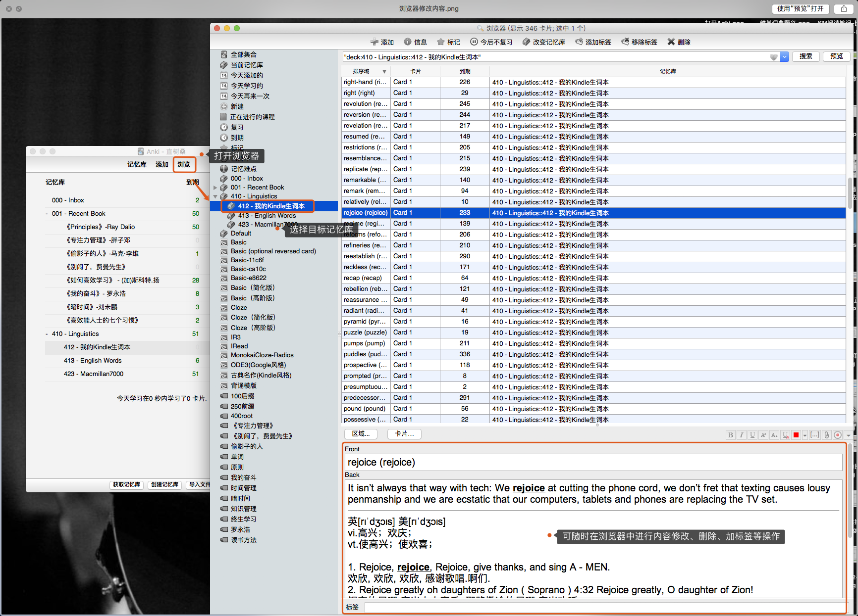 当我们导入了卡片之后,我们会存到我们的记忆库,如下图的「412 - 我的Kindle生词本」。如果想对记忆库中的卡片进行修改可以通过以下步骤进行:「打开Anki主界面 - 选择浏览 - 选择目标记忆库 - 修改」,具体如下图所示: