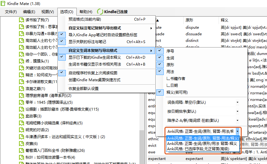 因此,我更推荐一个更综合的解决方案:借助 Kindle Mate 导出生词本,然后用 Anki 来学习、记忆。